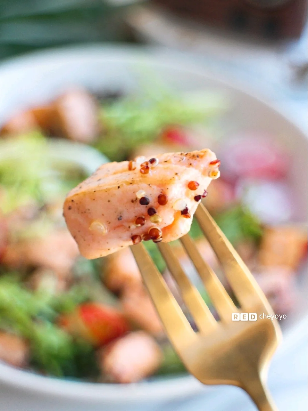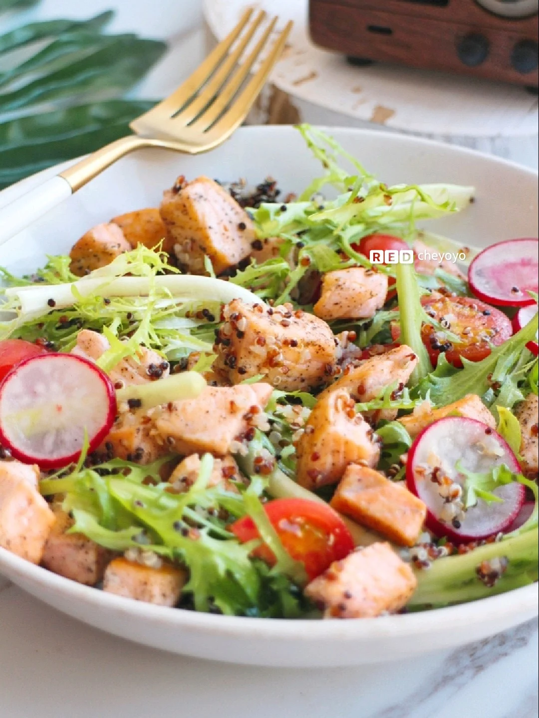 减肥餐一定要搭配合理,蛋白质、碳水化合物、脂肪,一样都不能少。这个三文鱼沙拉,营养均衡,低脂低热量,好吃饱腹又特别有满足感!推荐给一同减肥瘦身的你~[斜眼R]
