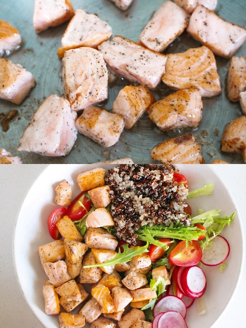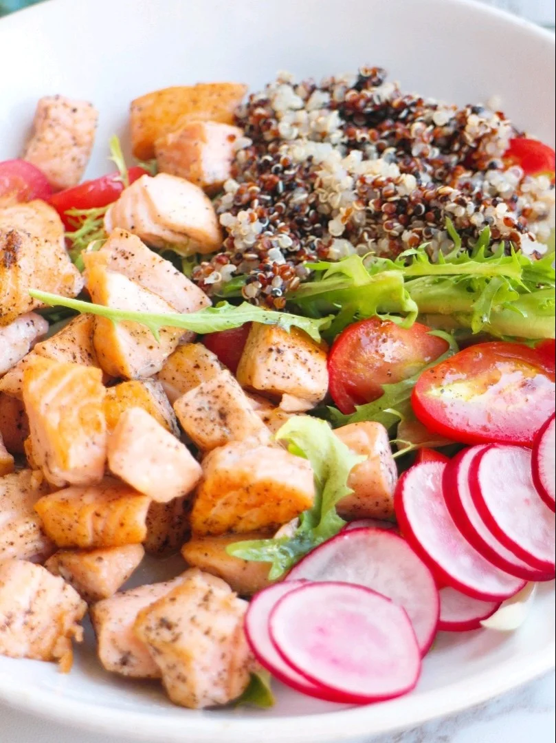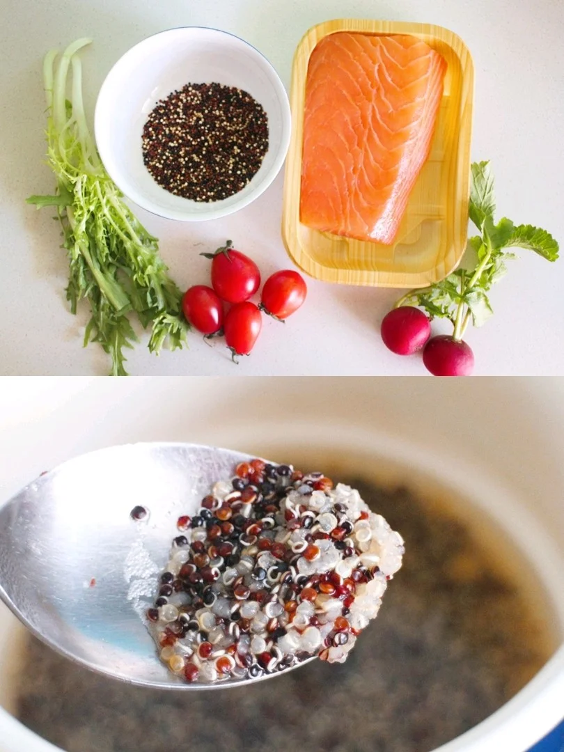 三色藜麦、三文鱼、樱桃萝卜、圣女果、苦苣、白醋、橄榄油、黑胡椒、盐