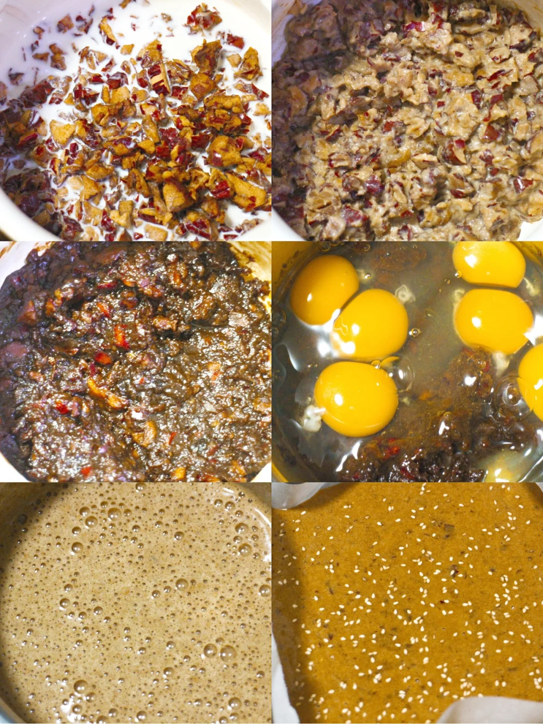 ⑦ 倒入铺好油纸的模具(👉不要用平盘,我用的8寸方形蛋糕盘)中,8分满,震出气泡后撒上白芝麻,送入150度烤箱烘烤40分钟左右即可。