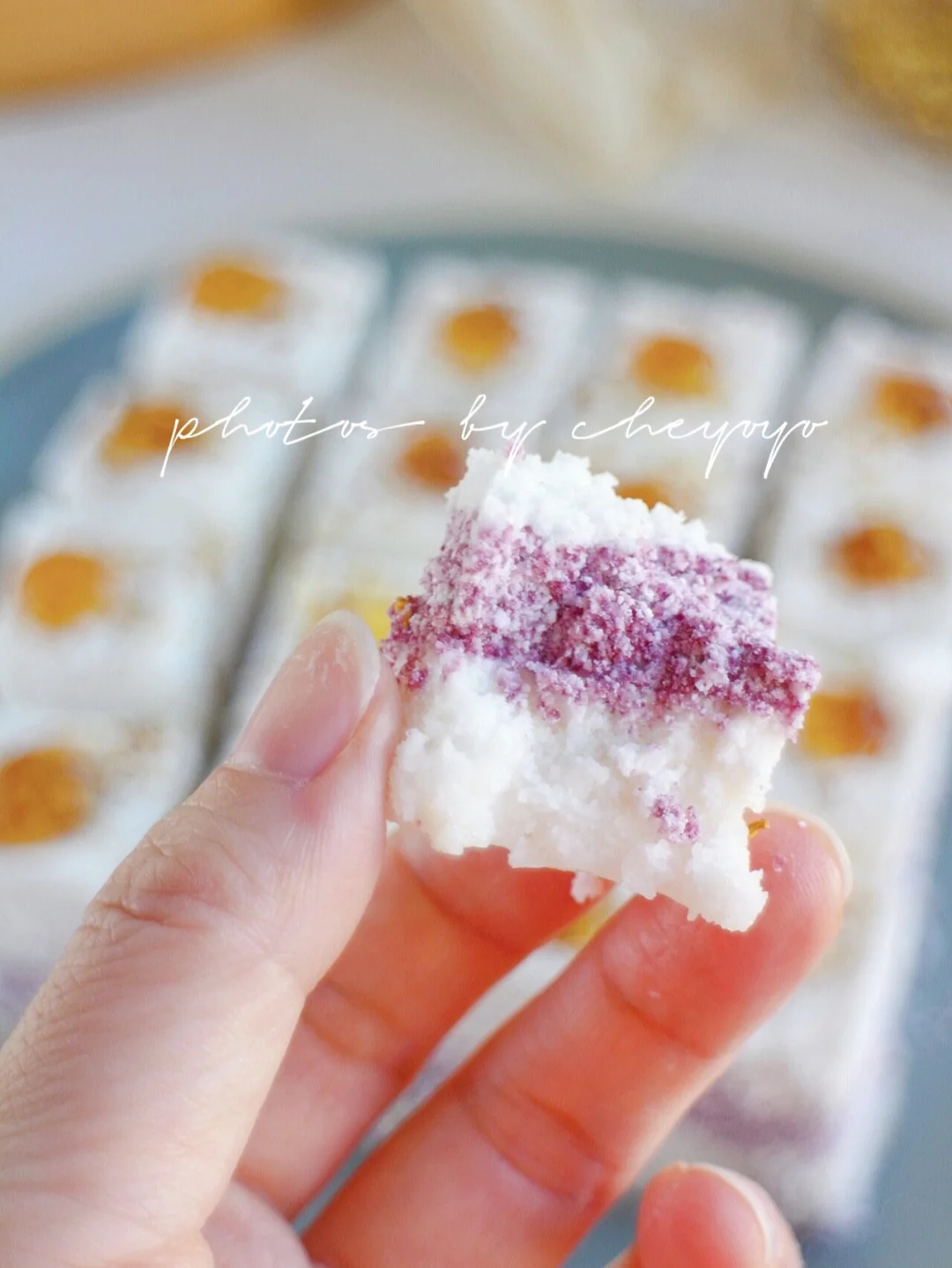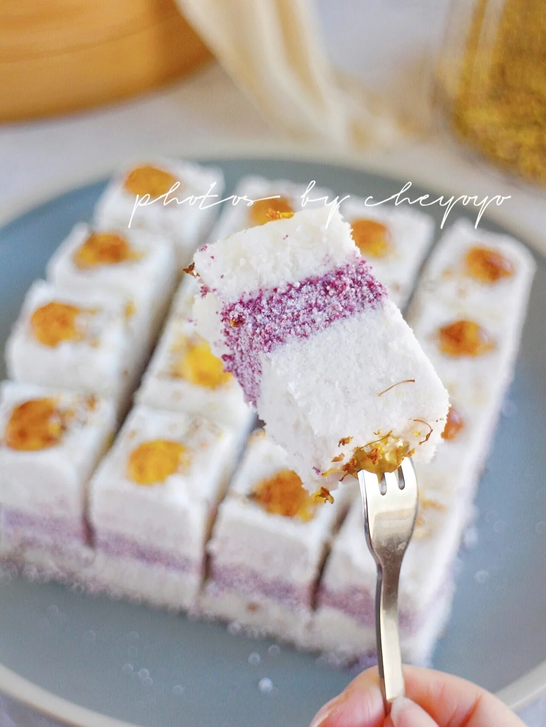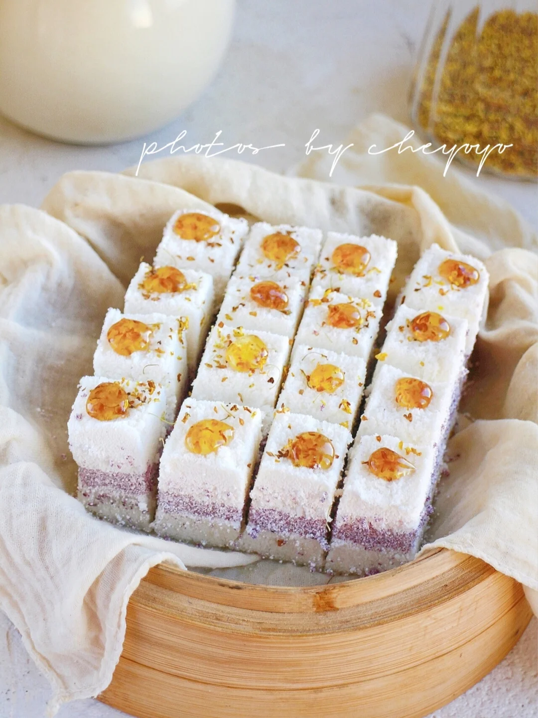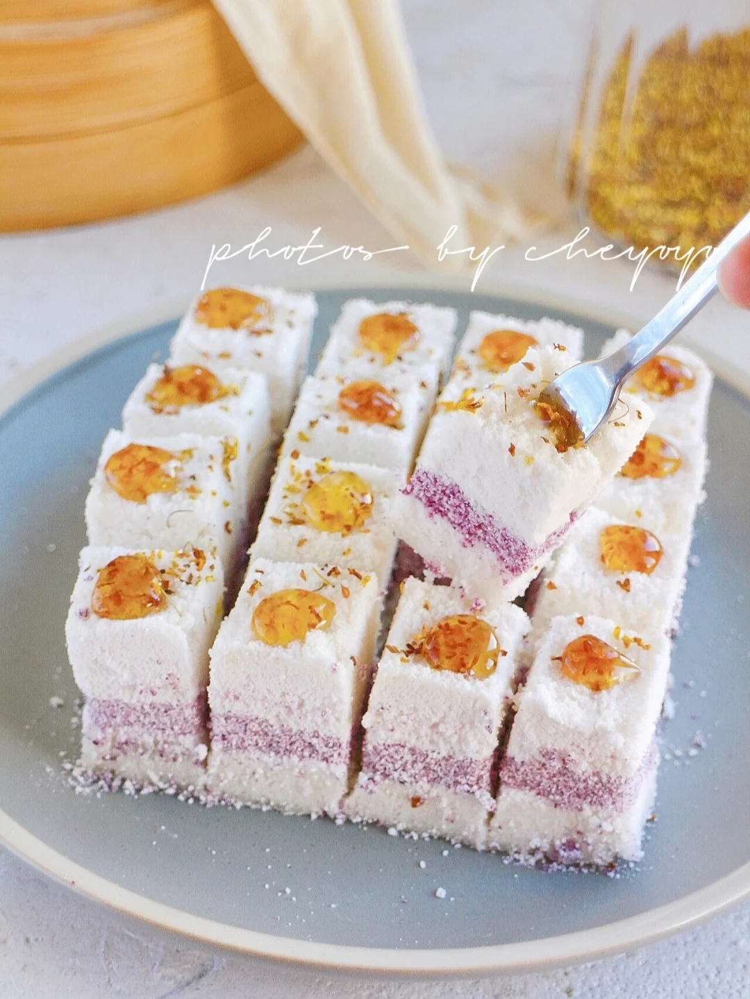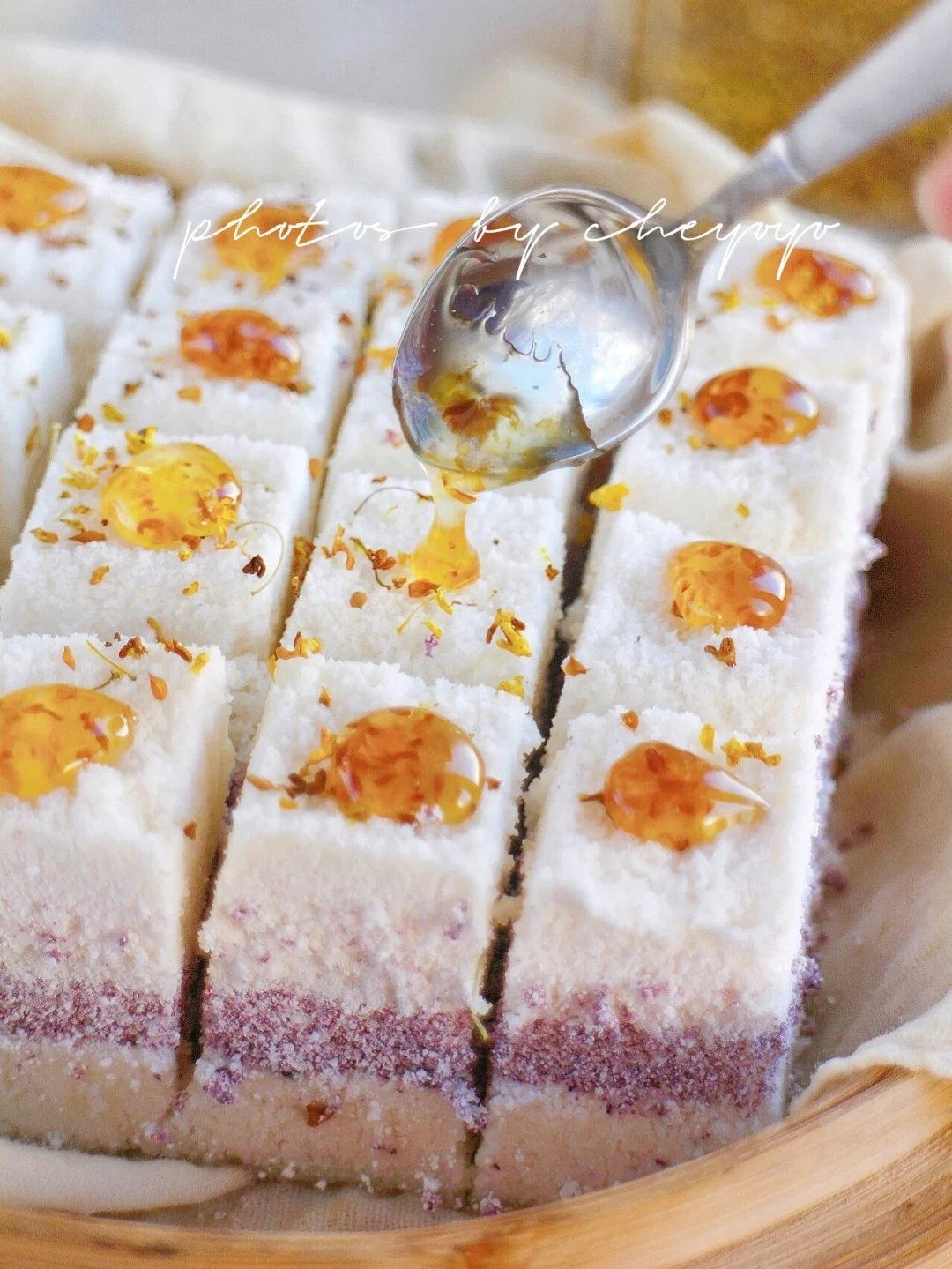没人能拒绝白白胖胖的桂花米糕吧!松松软软的米糕淋上香甜的糖桂花,真是太好吃了!加了些紫薯粉,为雪白的米糕增加一分紫色淡雅[偷笑R][偷笑R]原料简单做法也简单,轻轻松松就能搞定~[派对R]