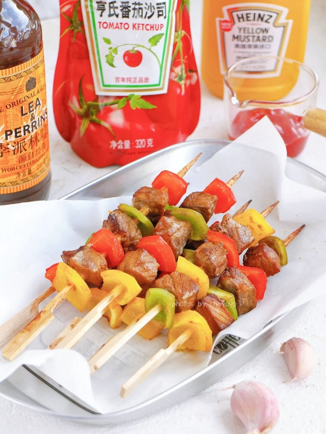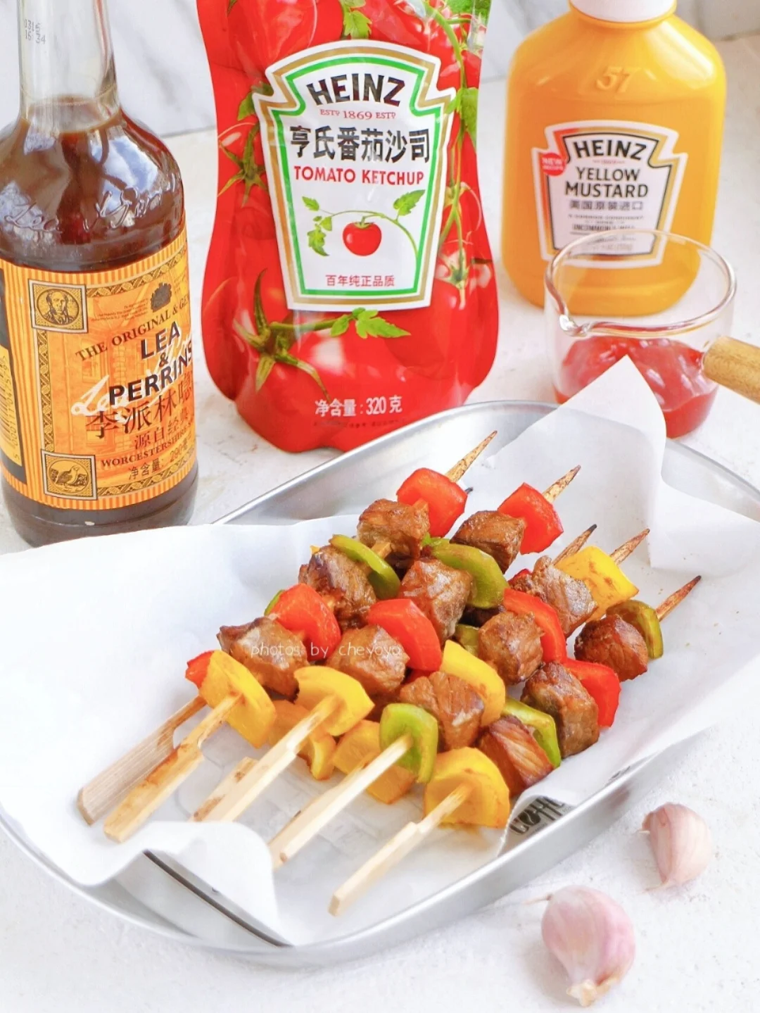 腌制后的牛肉串会更嫩更入味,秘制酱汁就是精髓所在,黄芥茉酱去腥解油腻,番茄酱提味增香[得意R][得意R]家里常备的番茄酱是亨氏番茄沙司,没有防腐剂、色素和增稠剂,味道酸甜浓郁,蘸薯条、拌意面都可以~
