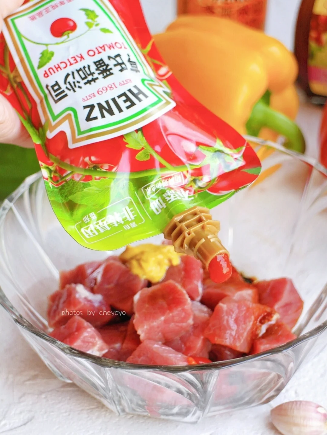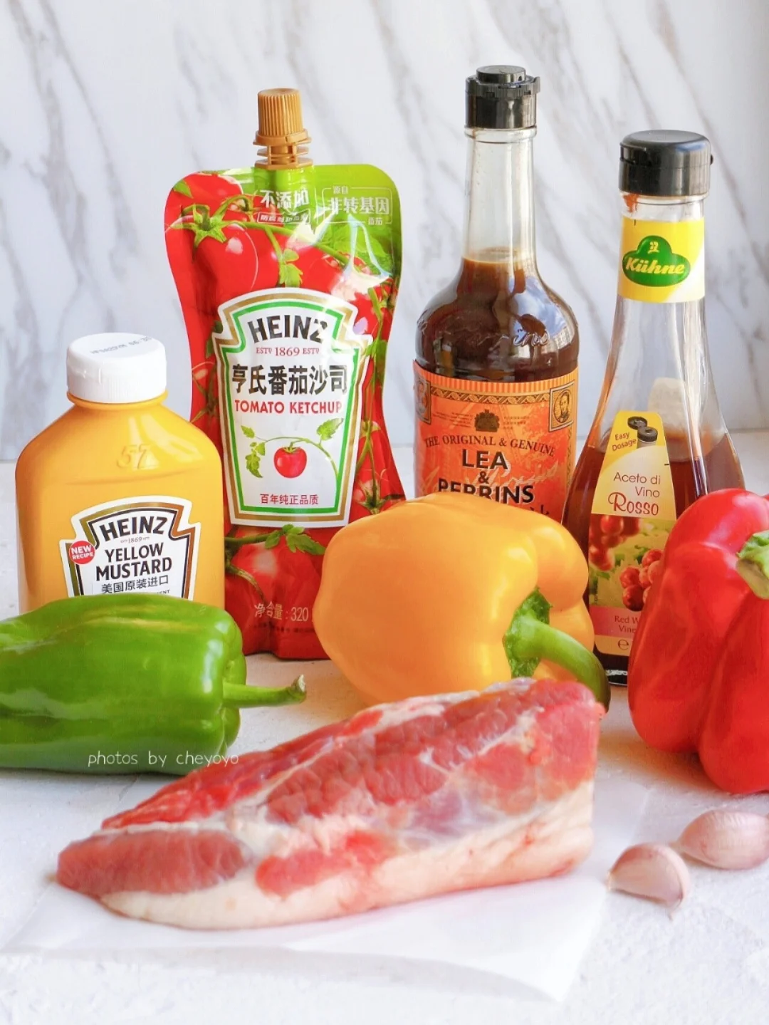 牛肉、彩椒、亨氏番茄酱、黄芥末酱、蜂蜜、红酒醋、橄榄油、李派林喼汁、酱油、黑胡椒