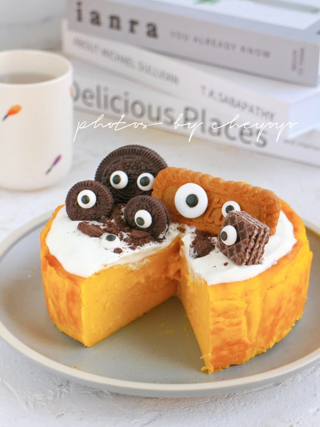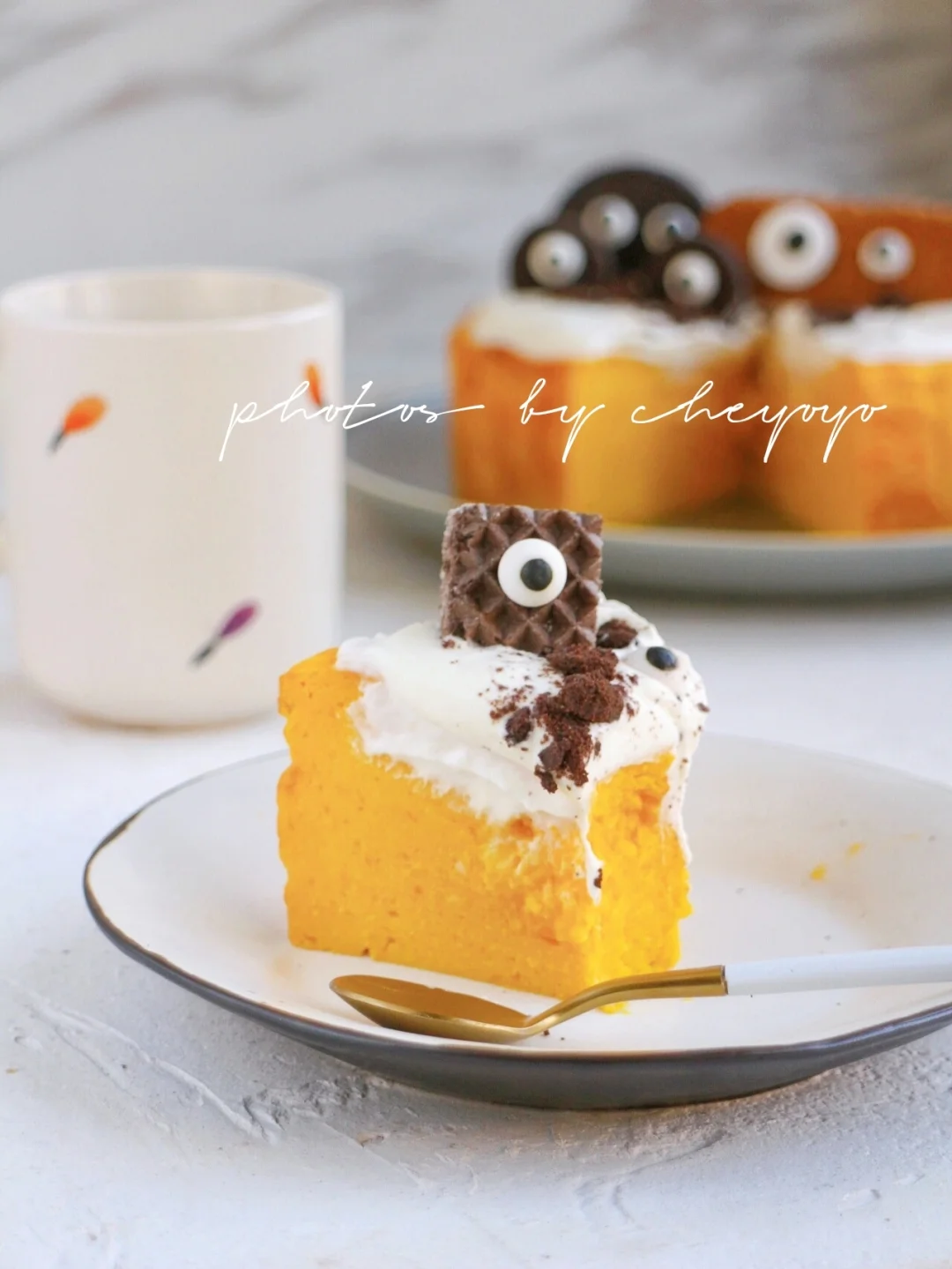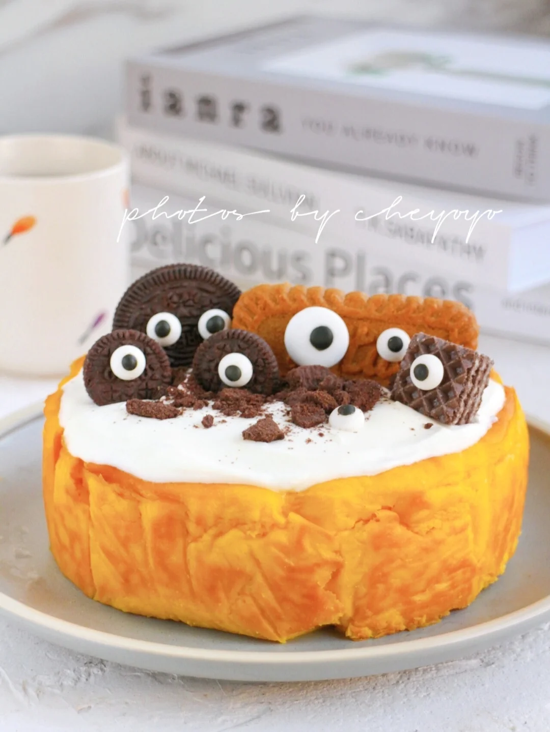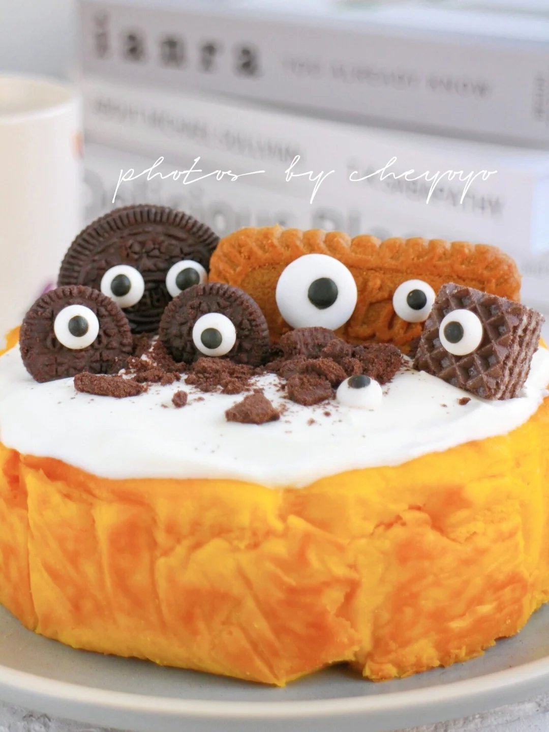 ④ 淡奶油加糖粉打发抹在蛋糕表面,撒上奥利奥碎,插上粘有眼珠糖的小饼干进行装饰就可以啦~👻👀