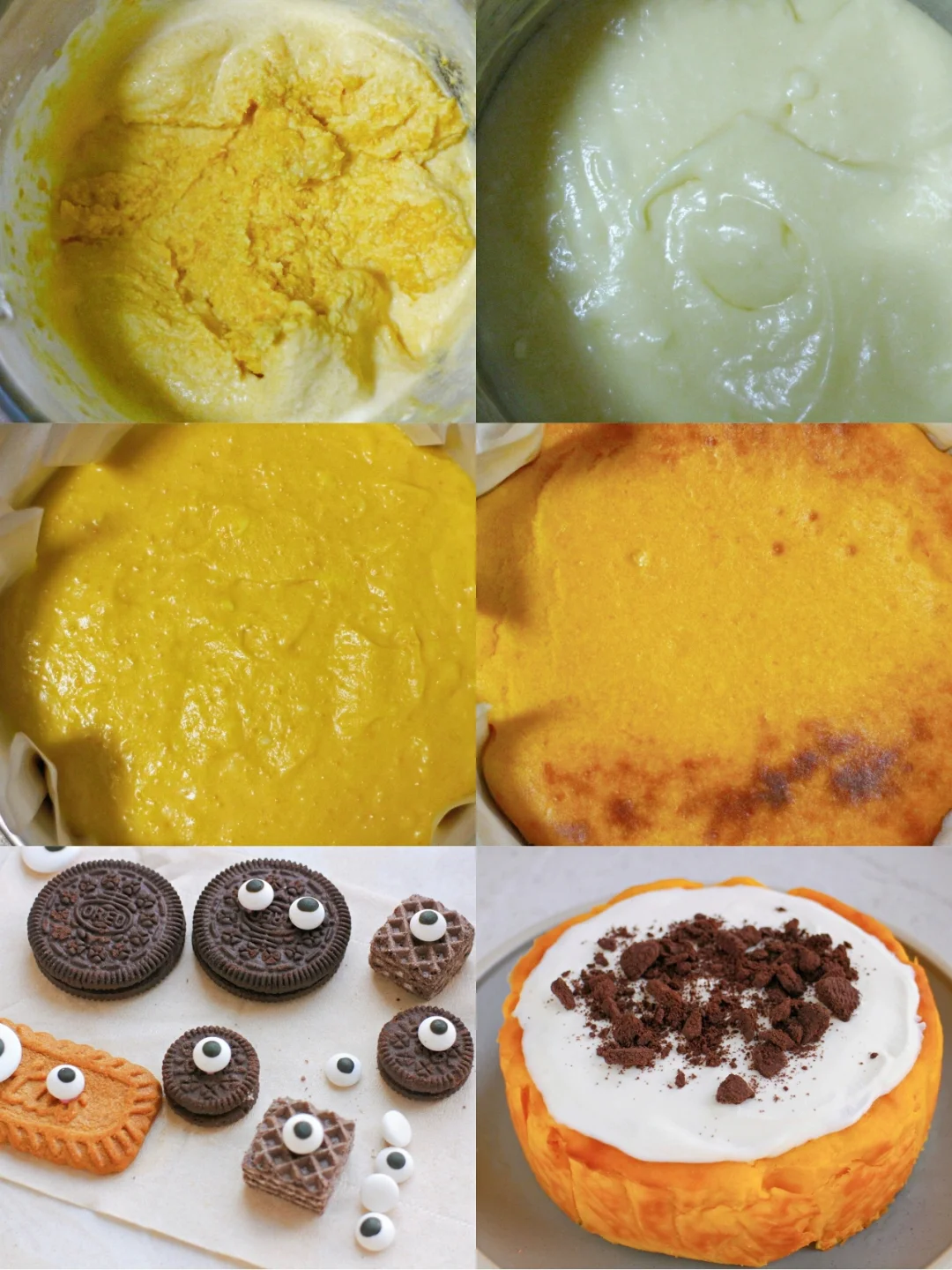 做法非常简单,全程都不需要打发,所有材料混合拌匀就可以了!应个万圣节的景,用饼干和眼珠糖做一些装饰,有那味儿了吧👻👻