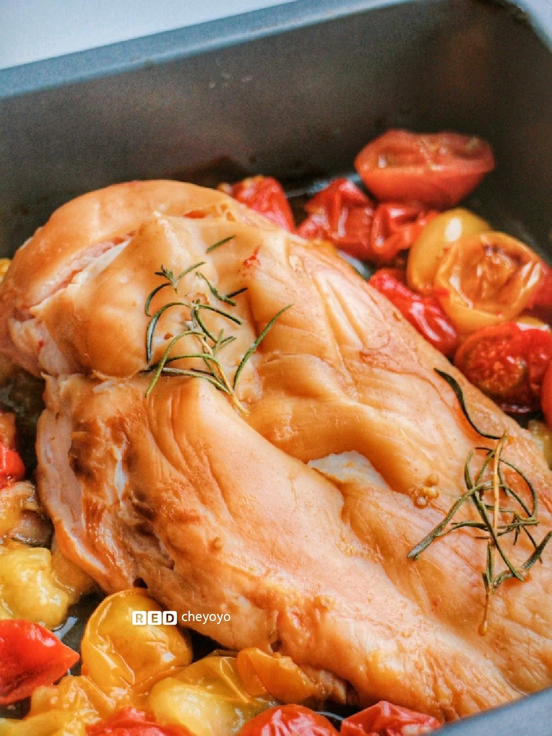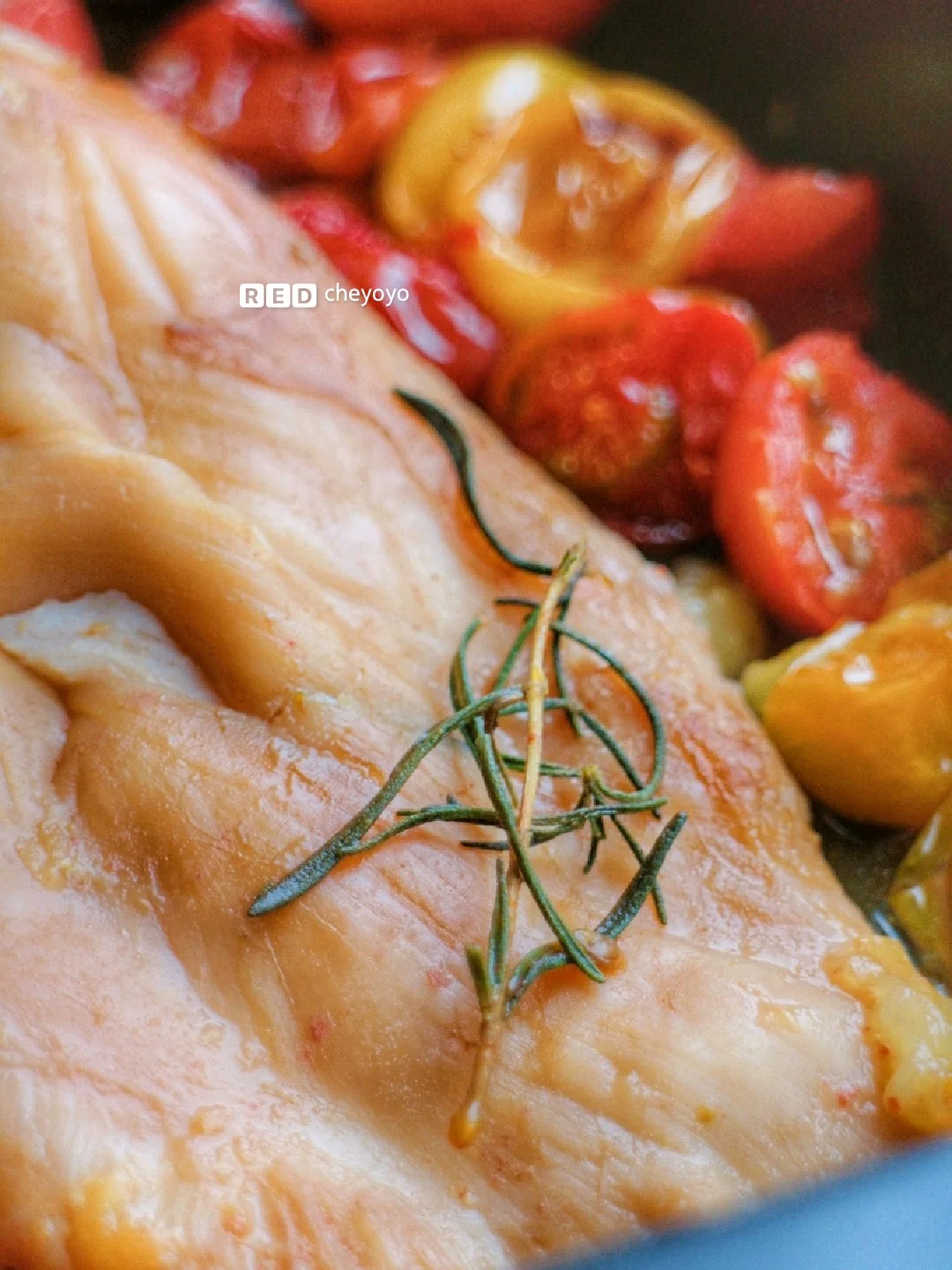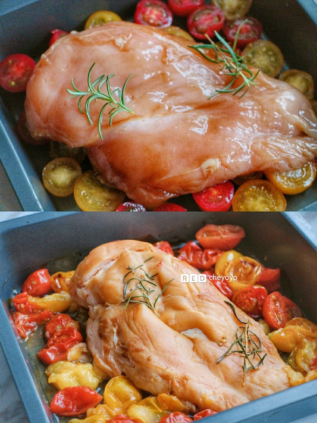 3⃣ 腌制好的鸡胸肉放在小番茄上,放上迷迭香(没有可不放);