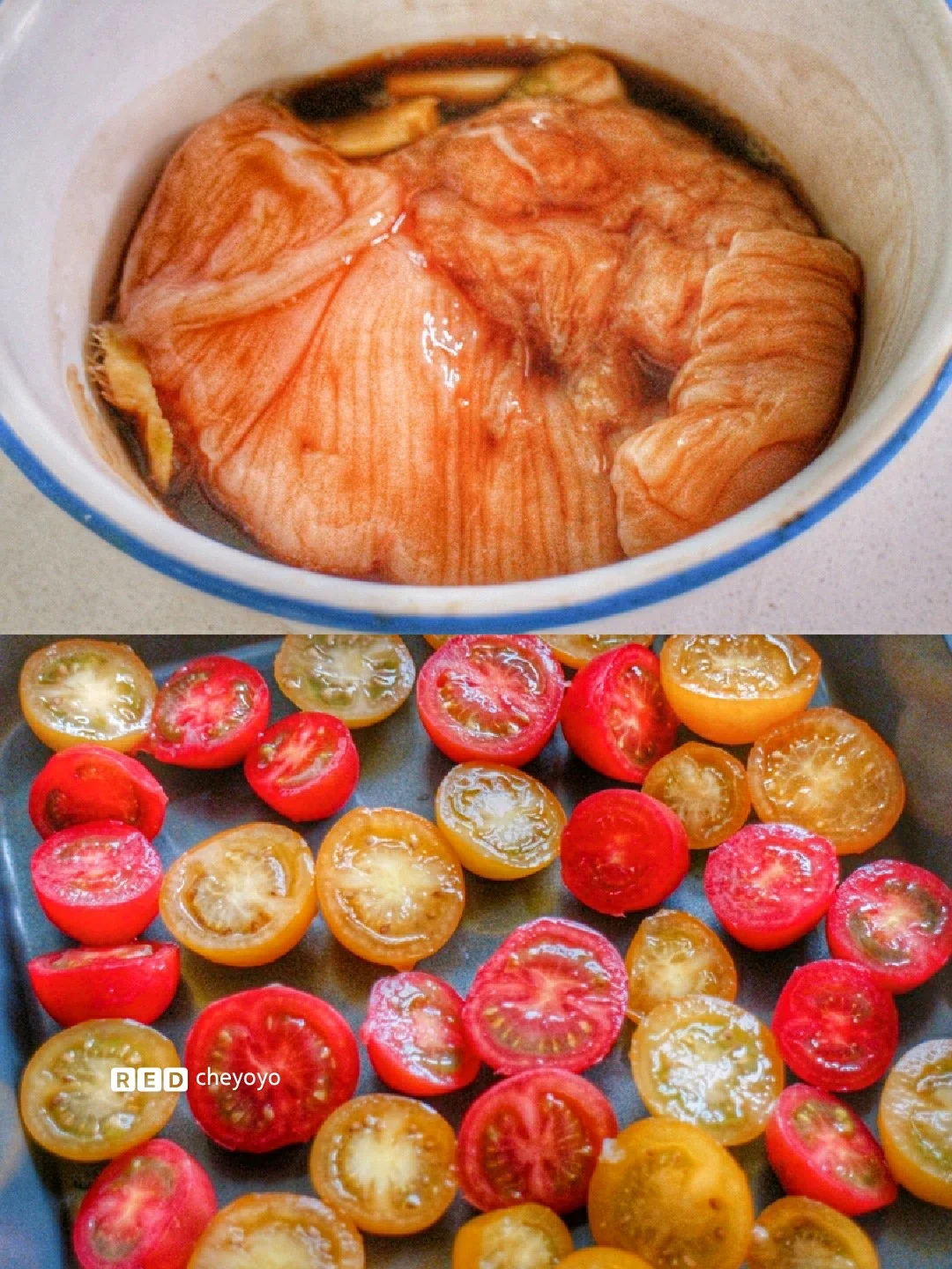 2⃣ 小番茄洗净切半,均匀铺在烤盘底部;