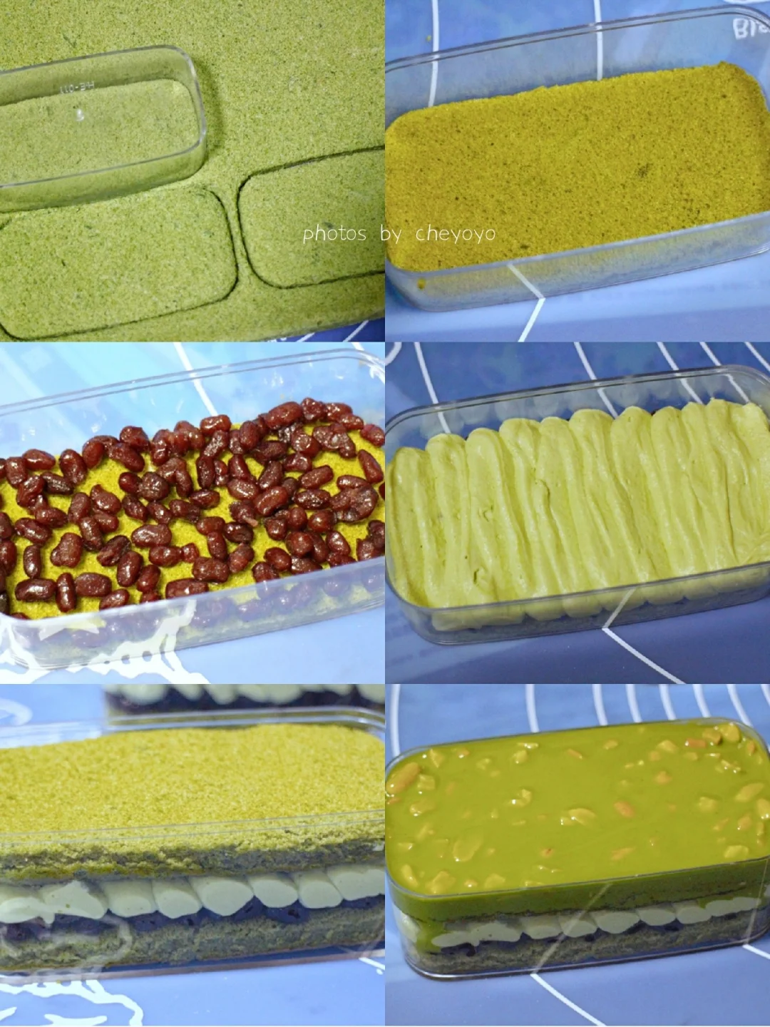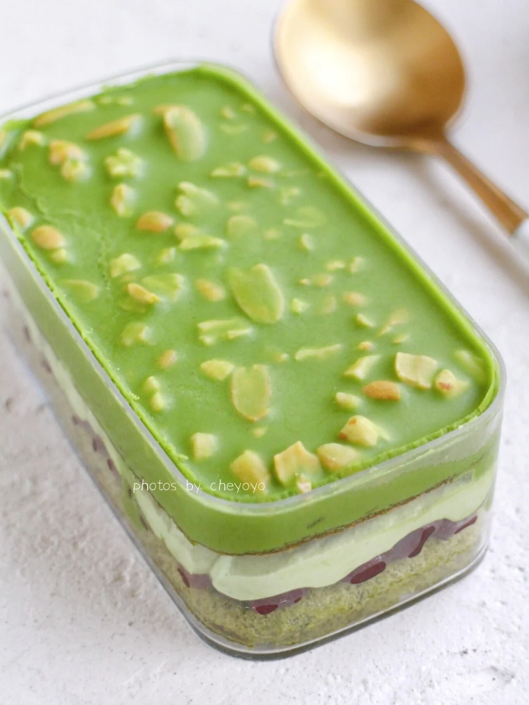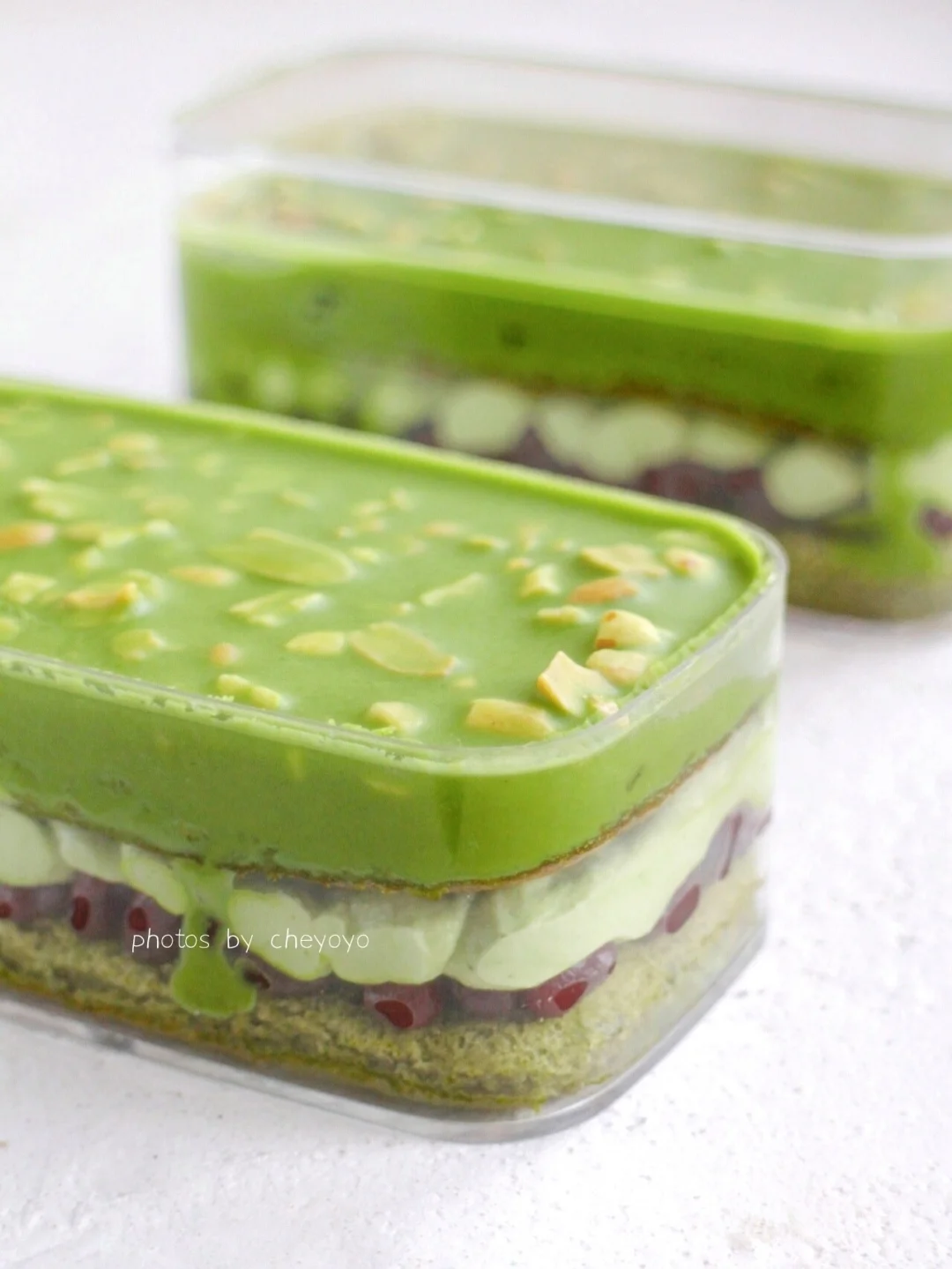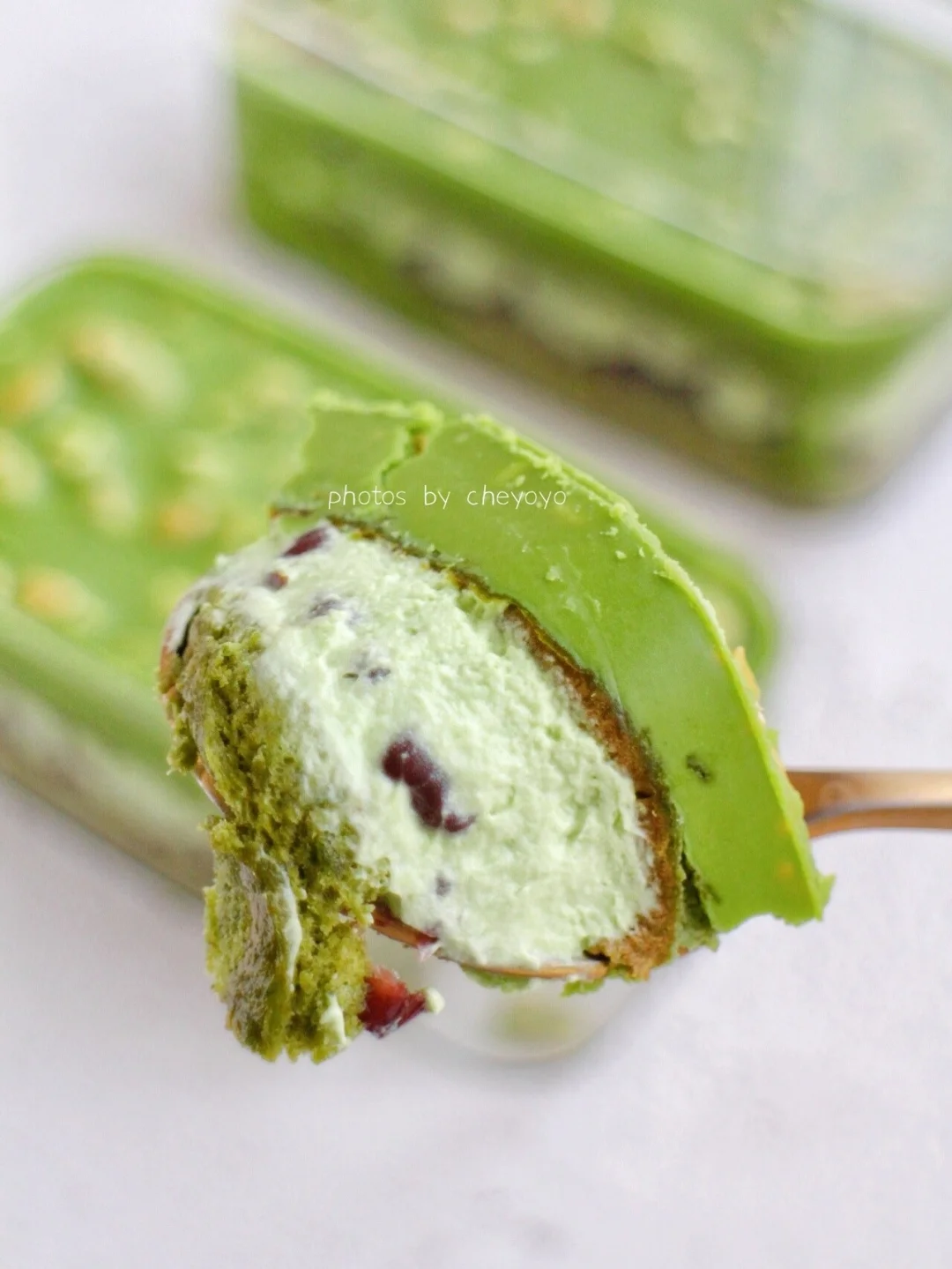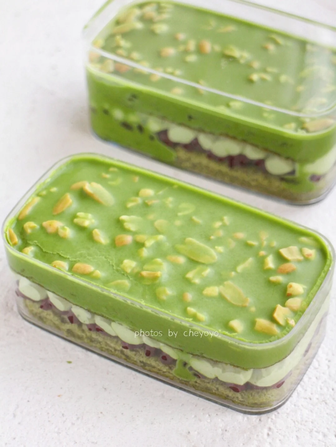 ⑦ 一层蛋糕胚,一层蜜红豆,一层抹茶奶油,一层蛋糕胚,再淋上梦龙淋面,放入冰箱冷藏至淋面凝固即可~[哇R][害羞R]