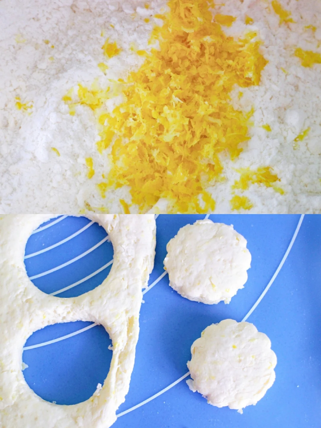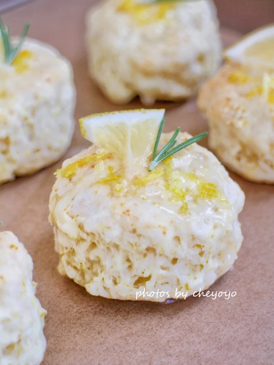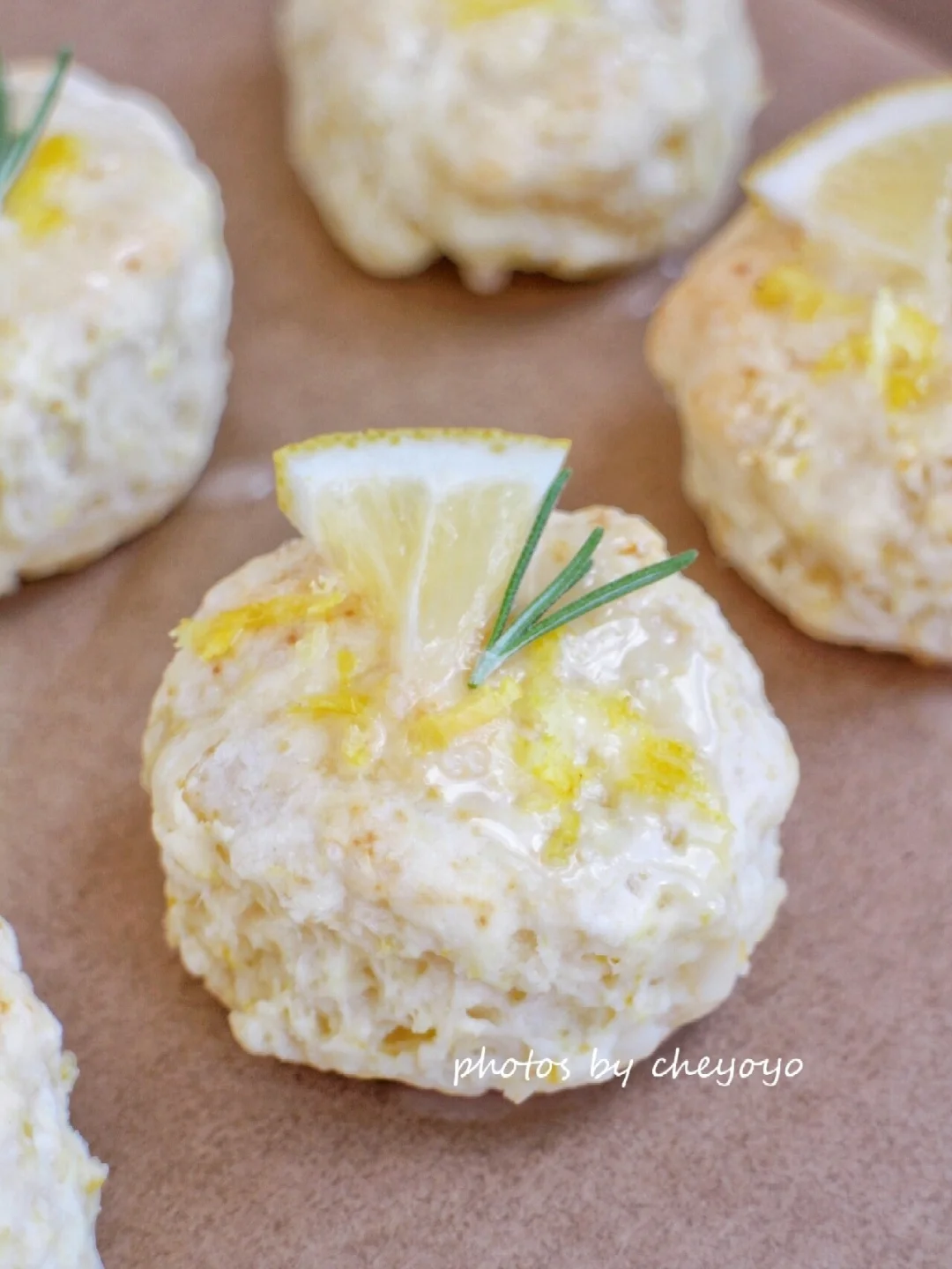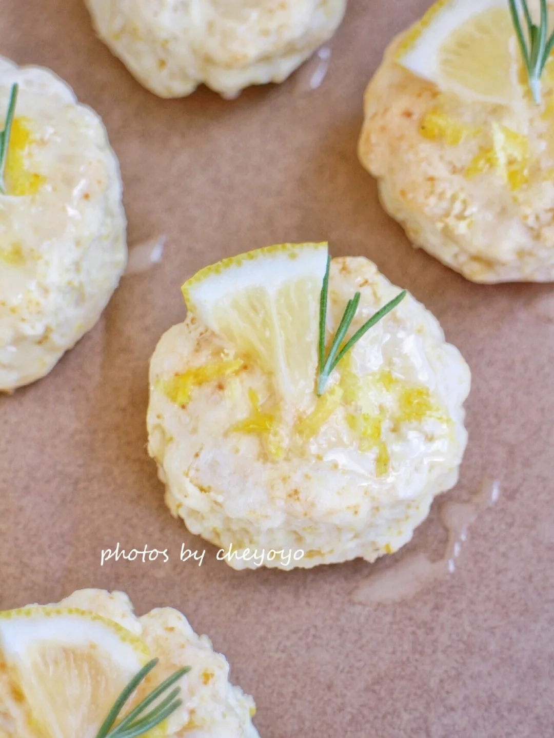 🔹加了柠檬皮屑的司康,味道清新不甜腻,外酥里软。做法简单,混匀送进烤箱就可以了,新手也能一次成功🍋 🔹【食材】 低粉100、糖10g、盐一撮、泡打粉3g、黄油20g、牛奶50g、柠檬、糖粉20g、柠檬汁5ml 🔹【做法】 ① 烤箱预热180度; ② 低粉、泡打粉、盐、糖混合过筛,加入黄油搓成粗玉米粉状; ③ 加入柠檬皮屑拌匀,加入牛奶拌匀压成团; ④ 擀成1厘米厚片后用模具压出,送入烤箱烘烤12分钟; ⑤ 糖粉和柠檬汁混合调成糖衣,浇在司康上,摆上柠檬和柠檬皮屑,就OK啦~[萌萌哒R]