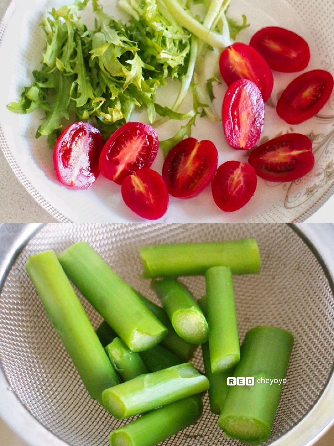1⃣苦苣、圣女果、芦笋洗净,芦笋切段焯水,苦苣、圣女果切半;