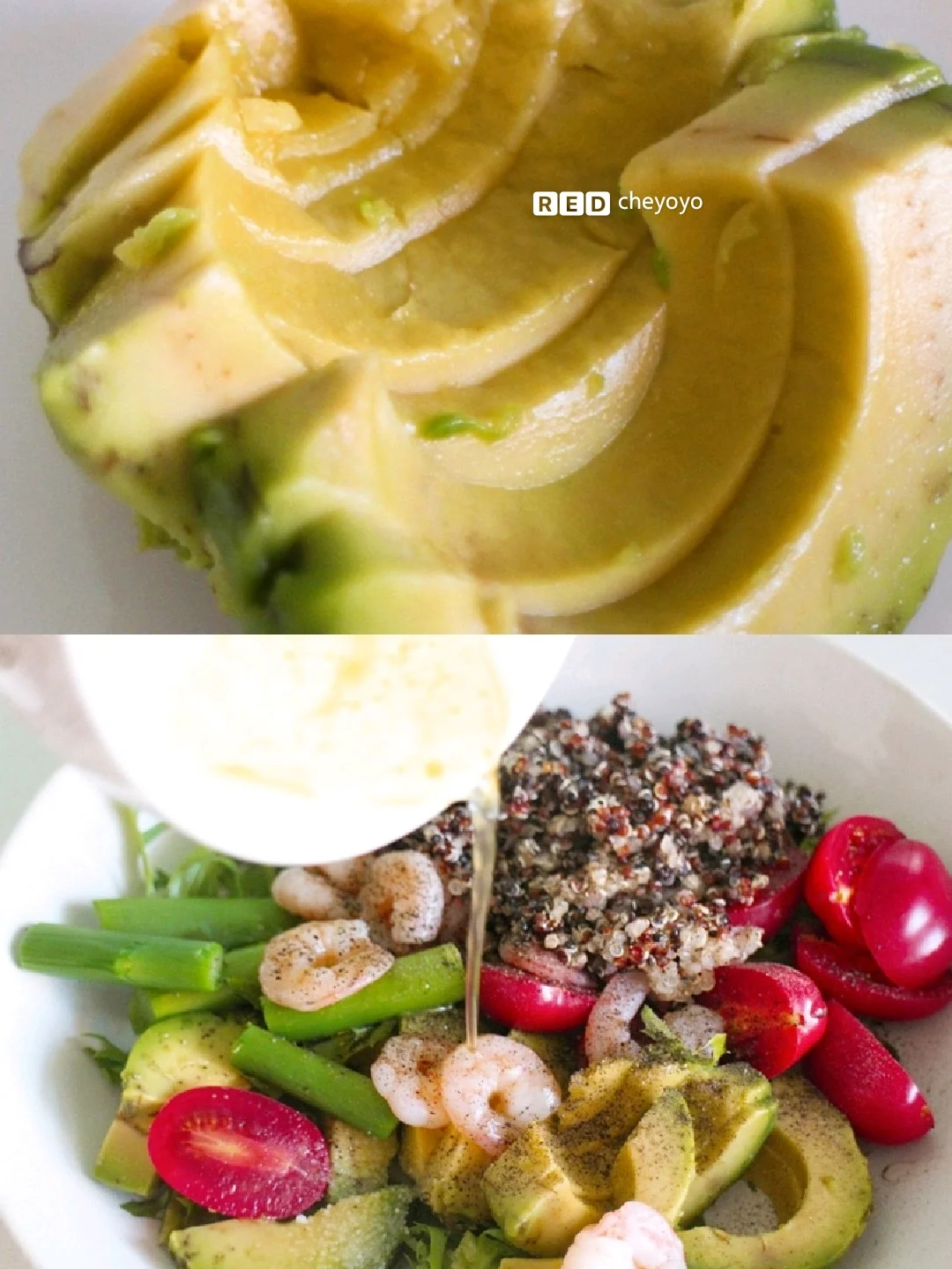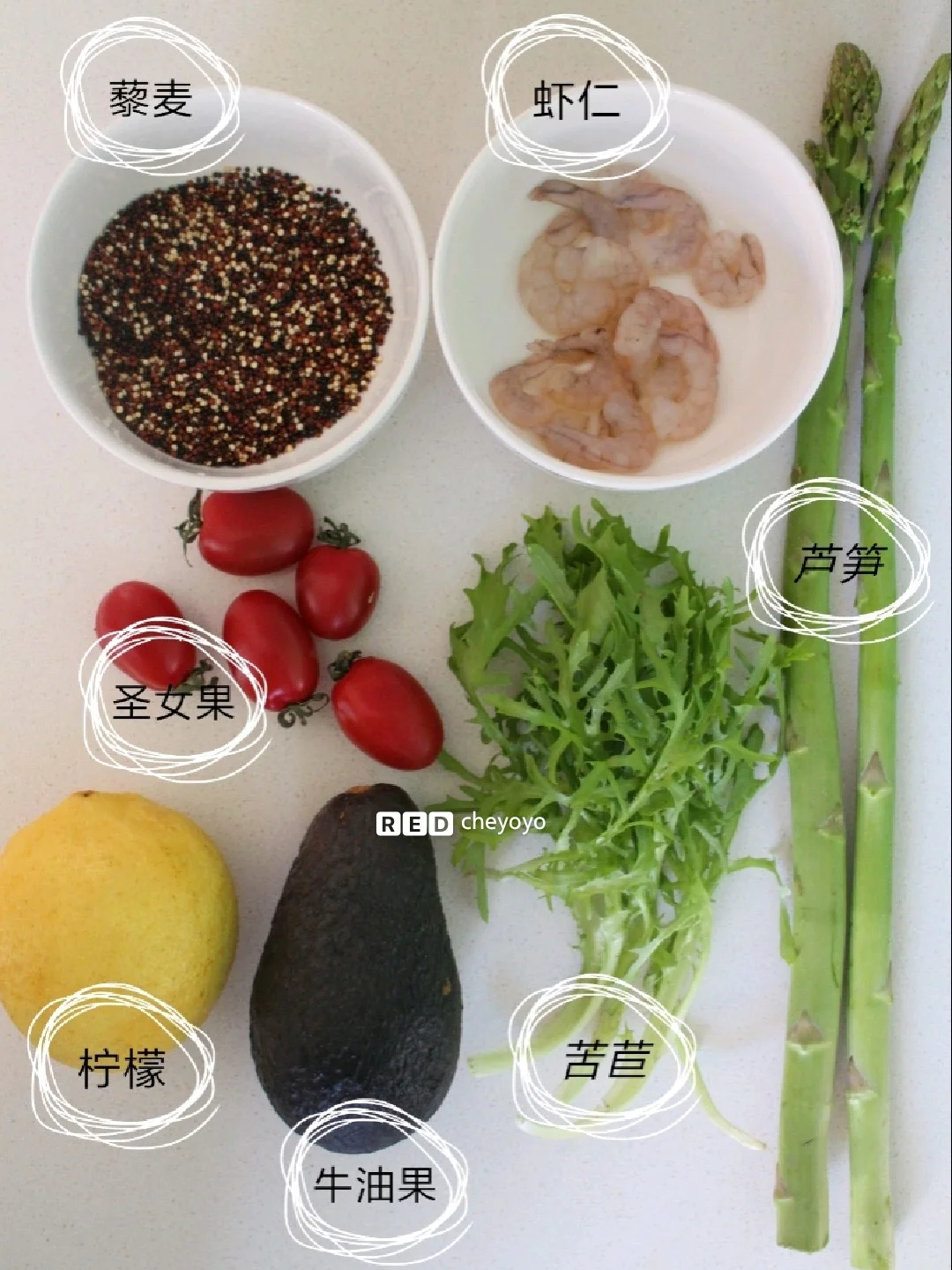 🍭【材料】三色藜麦、苦苣、虾仁、圣女果、芦笋、牛油果、柠檬、盐、黑胡椒、白醋、橄榄油