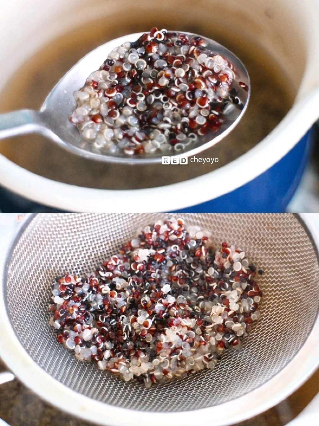 3⃣藜麦淘洗干净,加1.5倍水下锅煮15分钟,捞出备用;