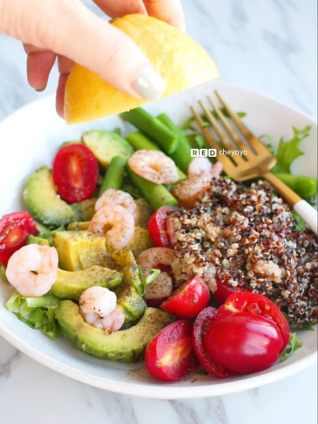 6⃣盘中摆入三色藜麦、苦苣、虾仁、圣女果、芦笋、牛油果,撒上黑胡椒和盐,淋入油醋汁,滴上几滴柠檬汁即可。