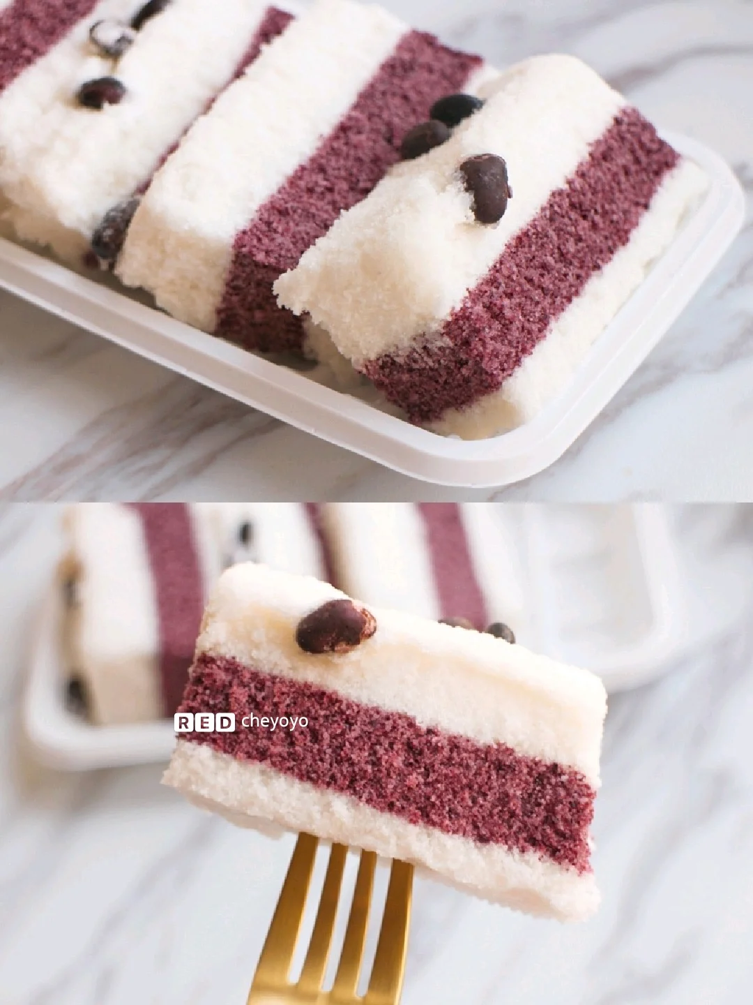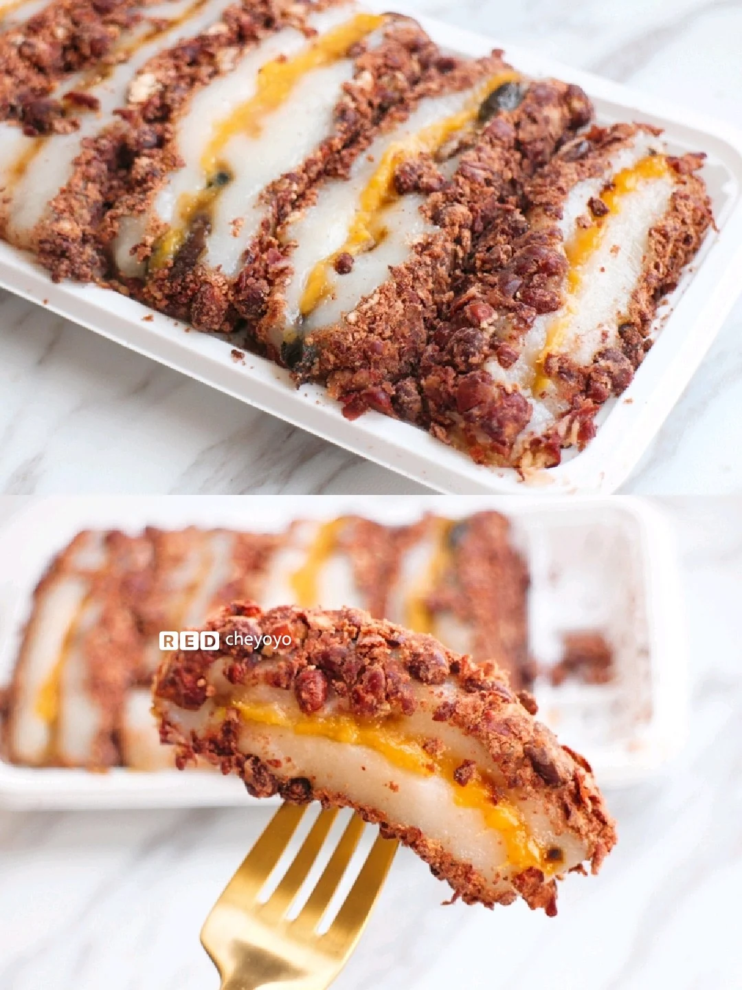 糯叽叽的年糕被碾碎的红豆包裹着,中间夹着软软的红薯泥,嚼在嘴里层次非常丰富,既有年糕的韧劲,又有红豆软绵沙糯的口感。颜色好看,甜度不高。