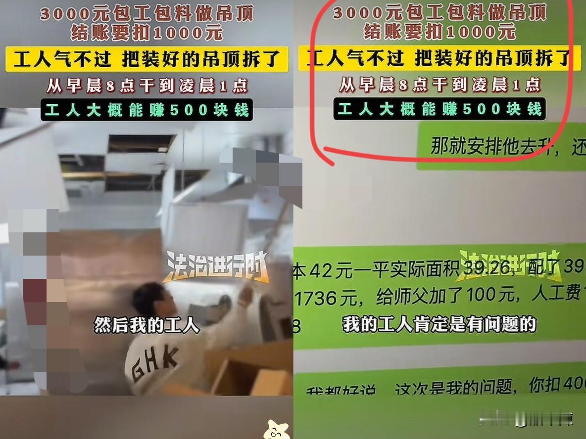 “真是损人不利己!”武汉老板3000元雇工人装吊顶,三个师傅从早8点干到凌晨1点,17小时高强度劳作熬得浑身是汗,结果结账时被硬扣1000元,理由竟是两三毫米的缝隙“不好看”。 师傅们要供娃上学、给老伴买药、还彩礼钱,这单活扣除成本才赚500多,扣1000相当于倒贴,协商调整被拒还遭拉黑,一气之下拆了自己包工包料的吊顶! 可老板也没占到便宜,开业泡汤、房租加铺货损失近两万,工人更是白干一天没拿到分文! 说白了,这闹剧根源就是没签书面协议,老板拿捏口头约定随意压价,工人被逼到绝境反击! 职场里最忌讳“口头承诺”,更怕不尊重劳动者的付出,两三毫米不影响使用的误差,凭啥否定17小时的辛苦?做人做事总得讲良心,互相体谅才不会两败俱伤?