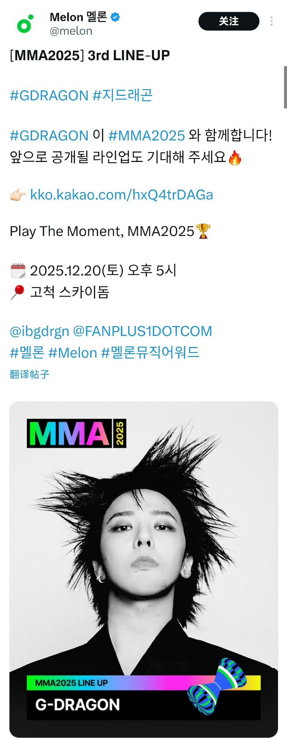MMA新增第三波阵容公布🎶权志龙确认加盟Melon Music Awards 2025