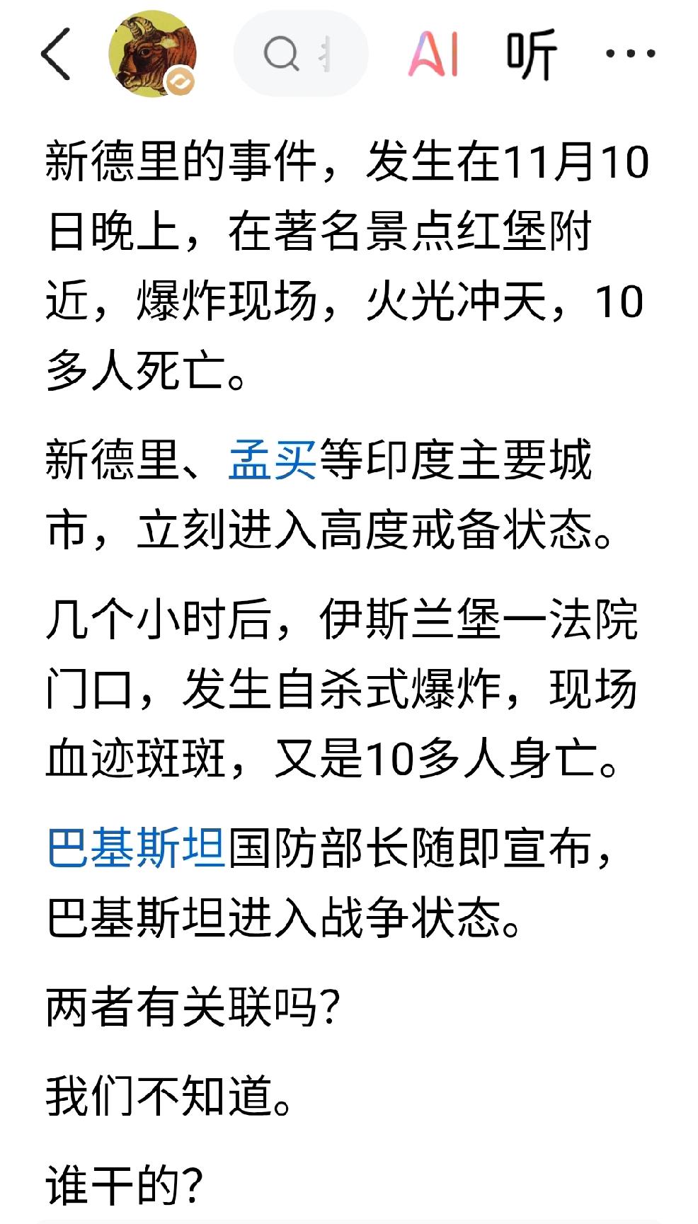 新德里-伊斯兰堡双爆炸案? 个人观点:新德里爆炸案,伊斯兰堡爆炸案,两起案件的最大受益者是谁?顺着这个思路就能破案。参考:今日热点(25年11月12日)北溪爆炸案,破案了,直接主谋:时任乌克兰武装部队总司令扎卢日内。 案件易破,幕后黑手置身事外。
