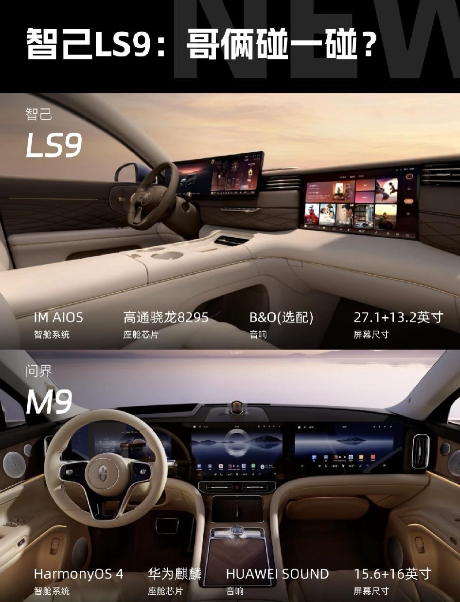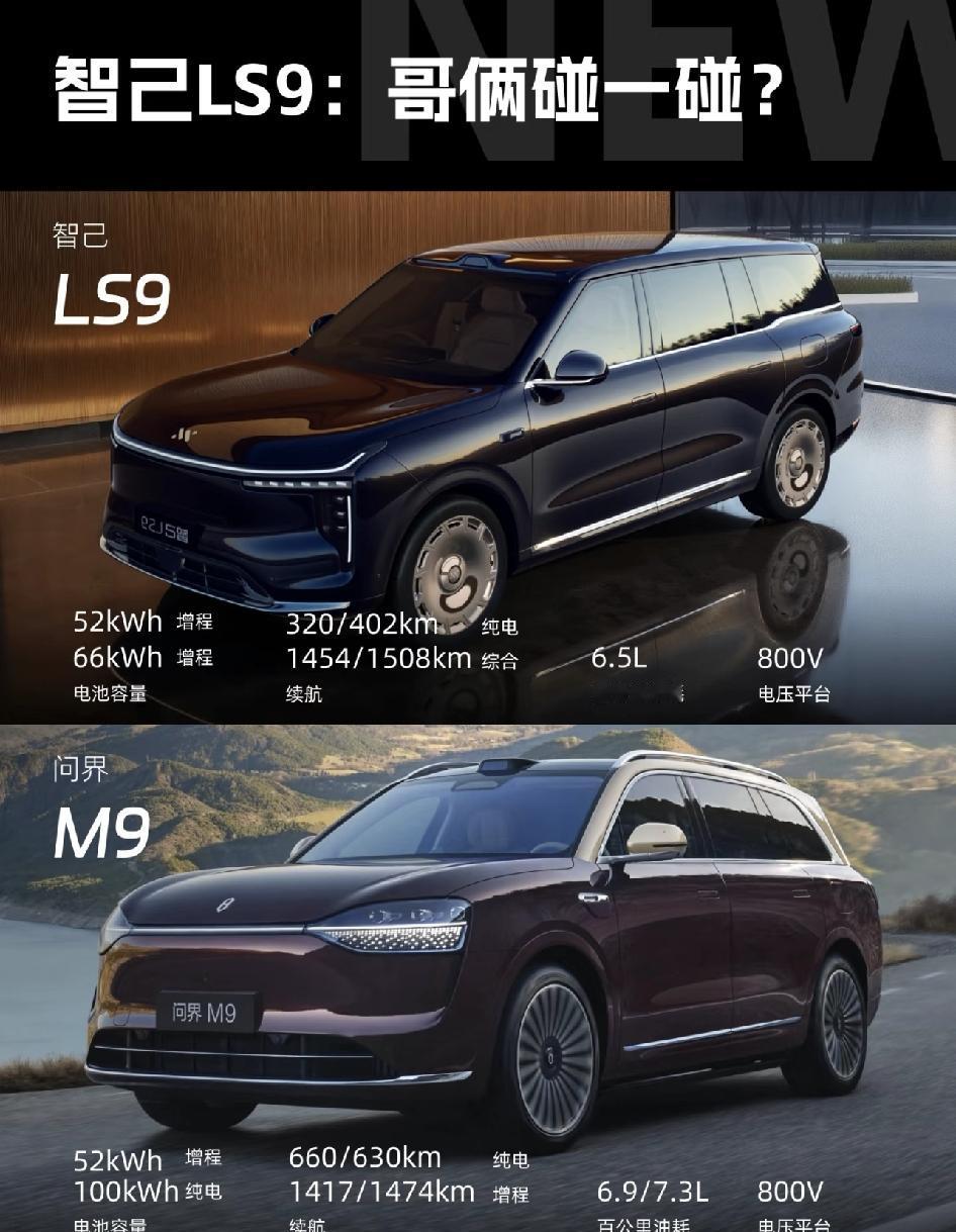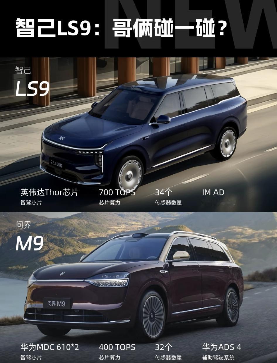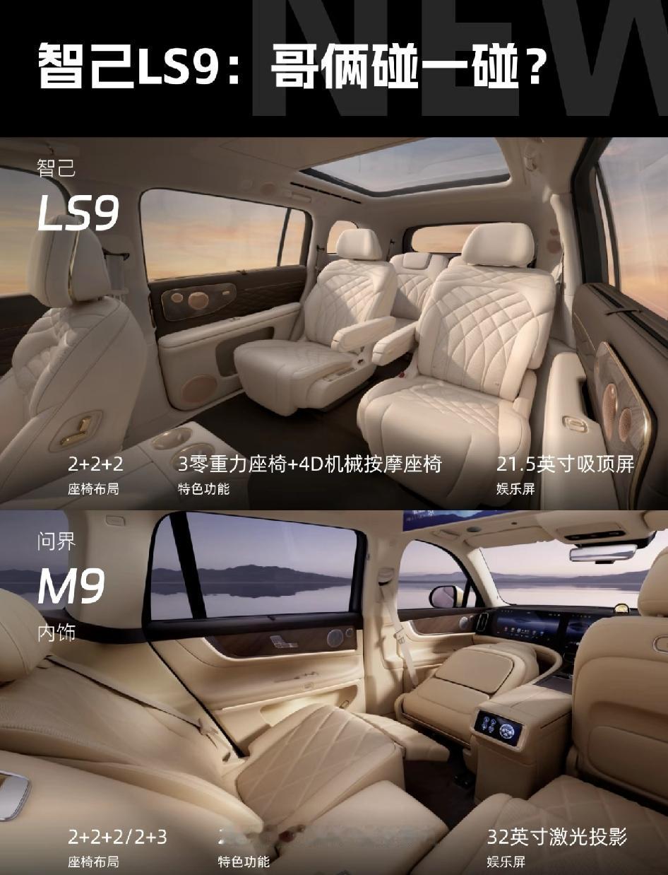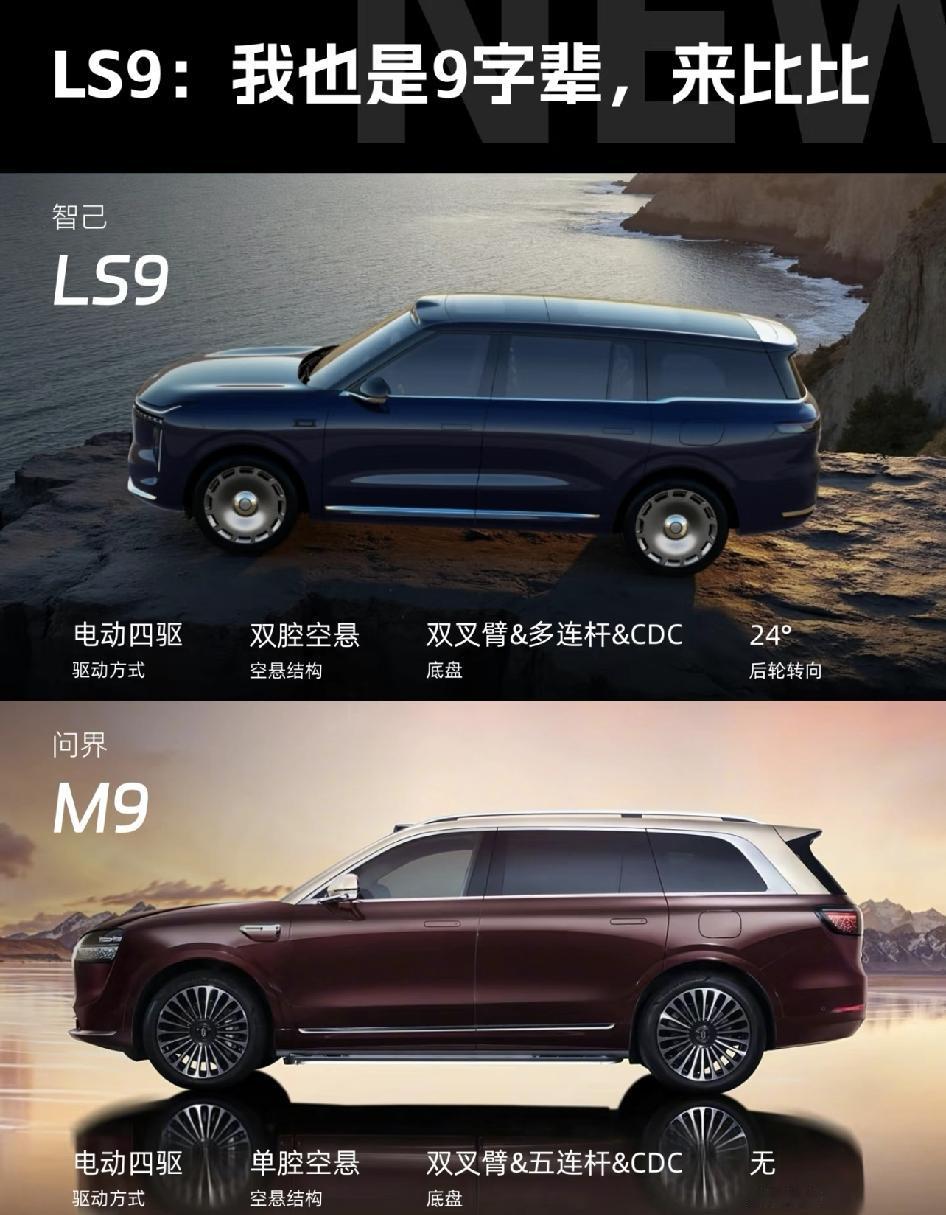 智己LS9: 9字輩,哥俩碰一碰? 智己LS9超5米的车长、6座布局、冰箱彩电大沙发满血智能配置,满足了家庭和商务用户的需求。 通过各种功能性配置,四轮转向、3重力座椅、4D机械按摩座椅、双腔空悬等配置加持,这样一台大六座SUV 如果拿来PK问界M9,你会选哪款?
