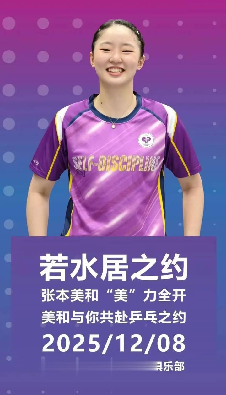 11月11日,成都高新若水居乒乓球俱乐部发布一则消息,该俱乐部将在12月8日举办与乒乓球运动员张本美和的“乒乓之约”。