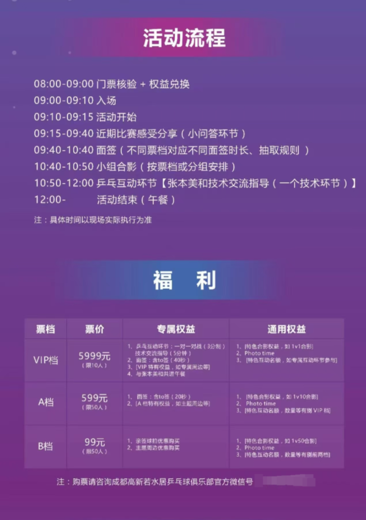 此次线下见面会VIP档为5999元(仅限10人),包括:一对一对战(3分制)、技术交流指导(5分钟)、1v1合影、共进午餐。