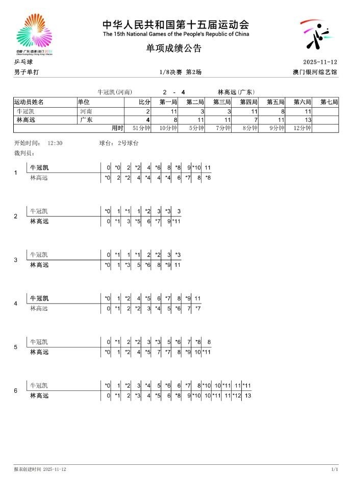 直播吧11月12日讯全运会乒乓球男子单打1/8决赛,林高远4-2战胜牛冠凯。