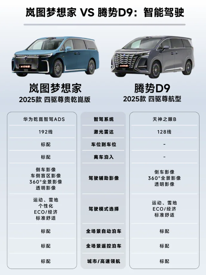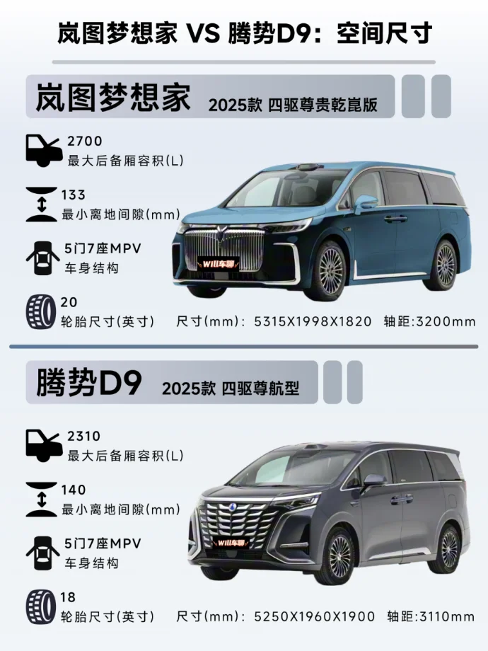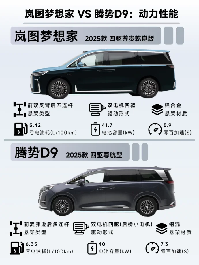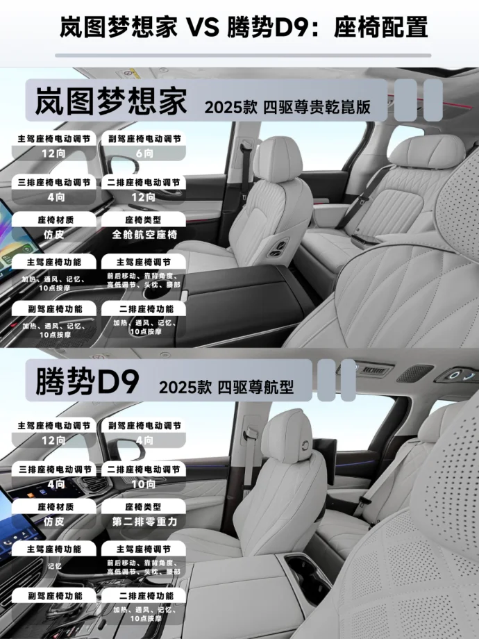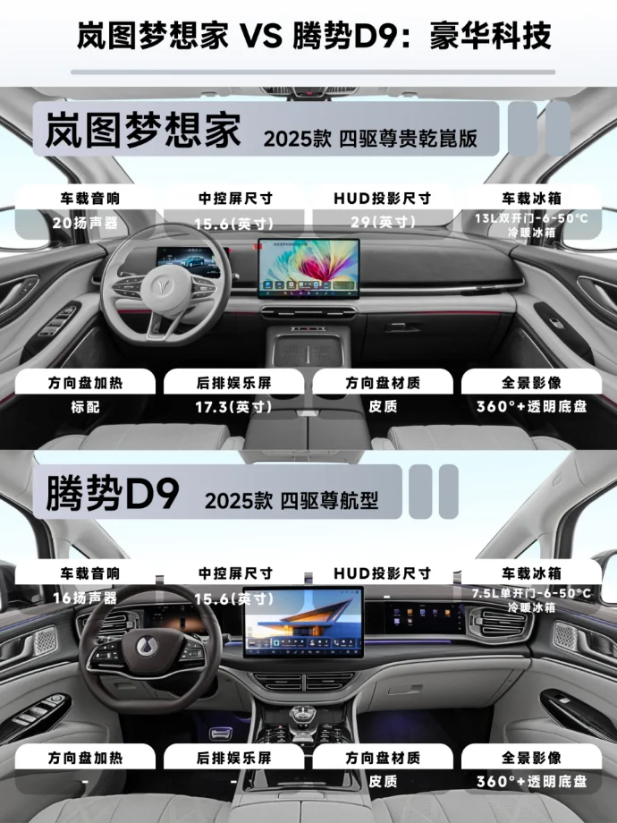 最近,2025款岚图梦想家尊贵乾崑版优惠价30万级💰,性价比拉满!和2025款腾势D9四驱尊航型一样,都是高端PHEV MPV热门选手✨~ 从尺寸、动力、座椅、科技和智驾5个维度对比,结合真实试驾体验分享,帮大家精准选车👇 空间尺寸🚗: 岚图梦想家以5315mm车长与3200mm超长轴距📏,营造出大气稳重视觉气场🏢,后备厢最大容积2700L,搭配20英寸轮胎,空间表现十分出众。 腾势D9车身长度5250mm、轴距3110mm。其后备厢最大容积2310L,满足日常使用需求。 动力性能⚡: 岚图梦想家搭载前双叉臂+后五连杆豪华悬架组合,全时双电机四驱系统,带来5.9s破百的强劲加速体验🚀,铝合金悬架材质更兼顾支撑性与舒适性。41.7kW大容量电池加持下,纯电续航可达235km;亏电油耗5.42L/100km。 腾势D9前麦弗逊+后多连杆悬架,配备双电机四驱(后桥为小电机),纯电续航190km,百公里加速7.3s,钢混悬架材质与40kW电池容量满足使用需求。 座椅配置💺: 岚图梦想家:主驾12向、副驾6向、二排12向、三排4向电动调节,全舱航空座椅设计,仿皮材质细腻有品。前排均配加热、通风、记忆、10点按摩功能,二排同样豪华配置。 腾势D9:主驾12向、副驾4向、二排10向、三排4向电动调节,第二排零重力座椅。主驾仅支持记忆功能,二排有加热、通风、记忆及10点按摩。 豪华科技📱: 梦想家搭配20个扬声器、15.6英寸中控屏、29英寸巨幕HUD;更有13L双开门冷暖冰箱。标配皮质方向盘加热;17.3英寸后排娱乐屏;360°+透明底盘全景影像为行车安全护航。 腾势D9科技配置也具实用价值:16个扬声器、15.6英寸中控屏、7.5L单开门冷暖冰箱,不过在HUD、方向盘加热、后排娱乐屏等配置上有所欠缺。 智能驾驶🤖: 岚图梦想家搭载华为乾崑智驾ADS系统,配备192线激光雷达,智能驾驶硬件与场景功能上颇具优势。其标配车位到车位、离车泊入功能,泊车场景更灵活,智能驾驶体验更完善。 腾势D9采用天神之眼B智驾系统,配备128线激光雷达,可满足智能驾驶的基础使用需求。 结论:如果你像我一样追求均衡配置+前沿科技,2025款岚图梦想家尊贵乾崑版真的值得冲🌟!欢迎大家评论区交流选车心得了💬~
