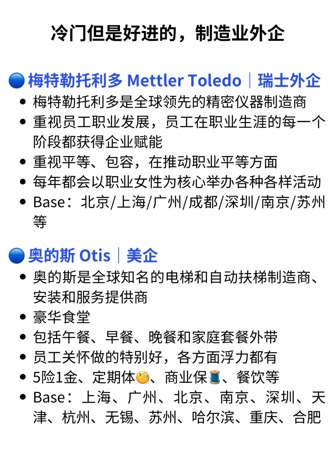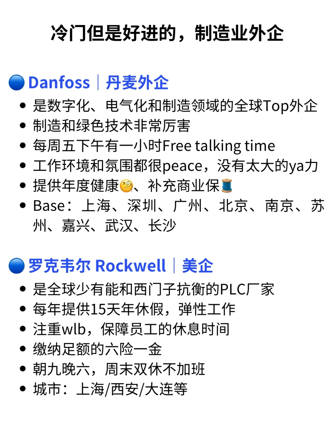 今天给大家分享的是发展非常平稳,而且work-life-balance的制造业外企,文科生也能入职! · ✅先说原因,为什么我建议大家求职制造业外企: 稳定的职业发展,成熟的企业架构 很好的平衡工作&生活,大多数公司有15天年假,甚至更多假期 基本不加班,有更多的个人时间 大多数制造业外企都有食堂,伙食丰盛 · ✅大家准备好中英文简历,大胆冲这几家宝藏外企吧(外企详细介绍👀看上图‼️) 🇨🇭梅特勒托利多 Mettler Toledo|瑞士外企 梅特勒托利多是全球领先的精密仪器制造商 重视员工职业发展 员工在职业生涯的每一个阶段都获得企业赋能 Base:北京、上海、广州、成都、深圳、南京、苏州等 · 🇺🇸奥的斯 Otis|美企 电梯和自动扶梯制造商、安装和服务提供商 豪华食堂,包括午餐、早餐、晚餐,还可以外带 Base:上海、广州、北京、南京、深圳、天津、杭州、无锡、苏州、哈尔滨、重庆、合肥等 · 🇩🇰Danfoss|丹麦外企 丹佛斯是数字化、电气化和制造领域的外企 每周五下午有一小时Free talking time Base:上海、深圳、广州、北京、南京、苏州、嘉兴、武汉、长沙 · 🇺🇸罗克韦尔 Rockwell|美企 罗克韦尔是全球少有能和西门子抗衡的外企 城市:上海、西安、大连等 · 如果你想求职其他城市的外企,也欢迎下方告诉我! · 🙋‍♂️我是瑞池,帮助大家稳拿好offer! 👉(求职版) 每天更新外企求职干货 👍往期干货: ✅荷兰外企过于冷门了,实际上很好进 ✅Marketing面试被问;什么是品牌公关BPR? ✅裸辞竟成了,外企面试加分点 ✅跳槽被问:你为什么离职?6个高情商回复 ✅大部份外企英文面试,都是考常规题 -