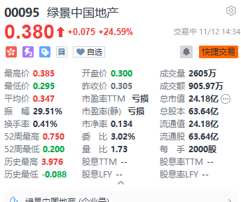上证报中国证券网讯(记者杨子晏)11月12日,绿景中国地产盘中一度涨超26%,最高价报0.385港元/股。截至14时34分,绿景中国地产报0.38港元/股,涨24.59%,总市值约24.18亿港元。