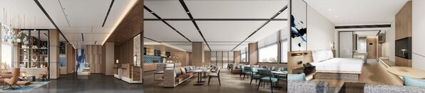 从左至右(效果图):常州溧阳万豪万枫酒店大堂、枫悦餐厅、客房