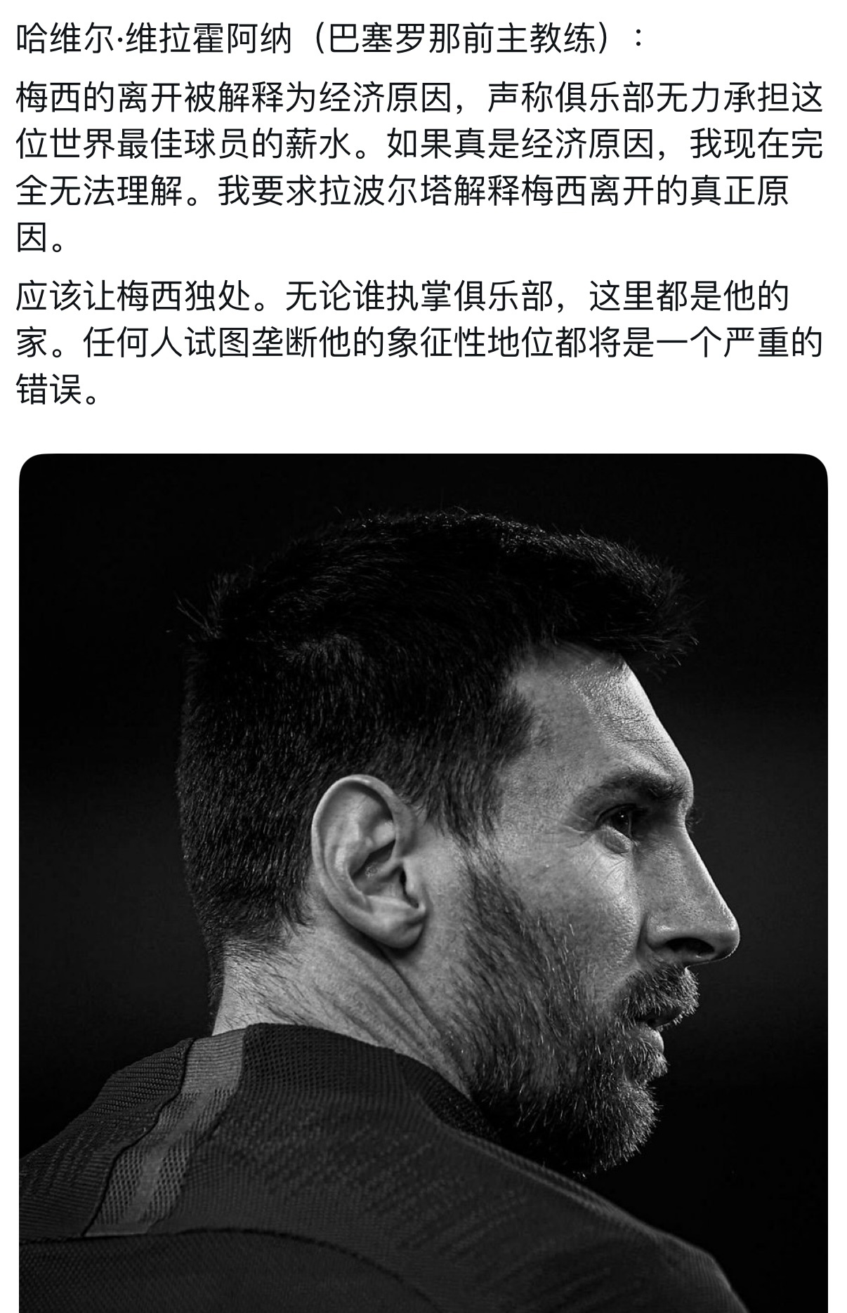 巴萨前董事哈维尔·维拉霍阿纳:梅西的离开被解释为经济原因,声称俱乐部无力承担这位世界最佳球员的薪水。如果真是经济原因,我完全看不出有什么道理。我要求拉波尔塔解释解雇梅西的真正原因。无论谁执掌俱乐部,这里都是梅西的家。任何人试图垄断他的象征性地位都将是一个严重的错误。