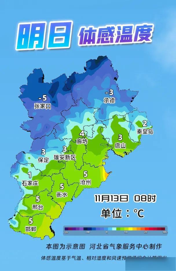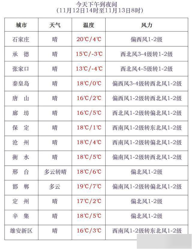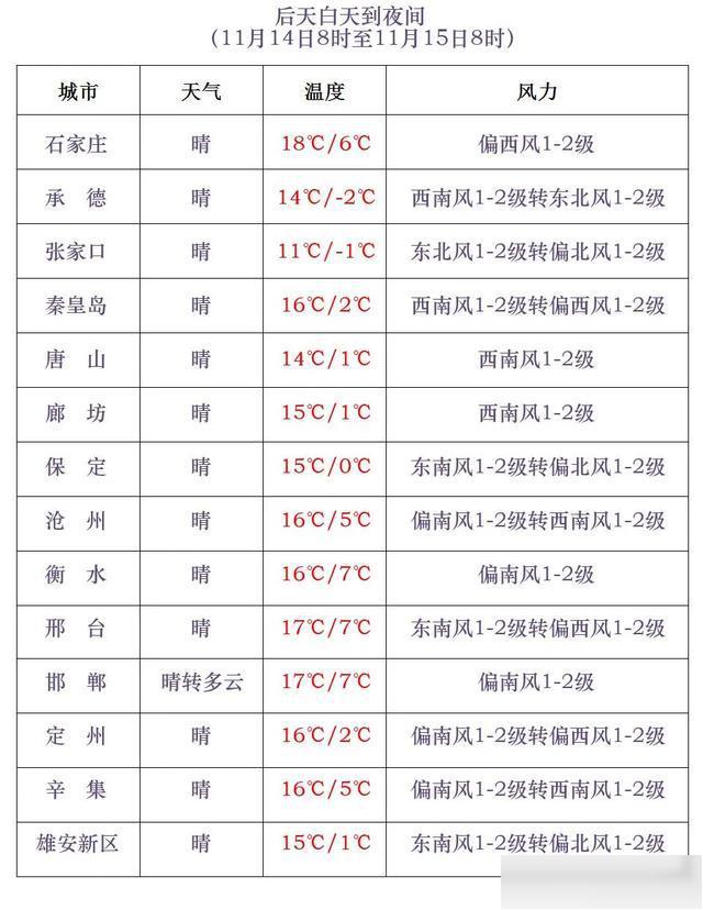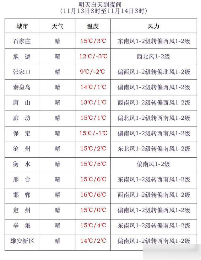 明天白天,全省晴间多云。最高气温,张家口、承德、秦皇岛北部、保定西北部2~13℃,其他地区14~19℃。