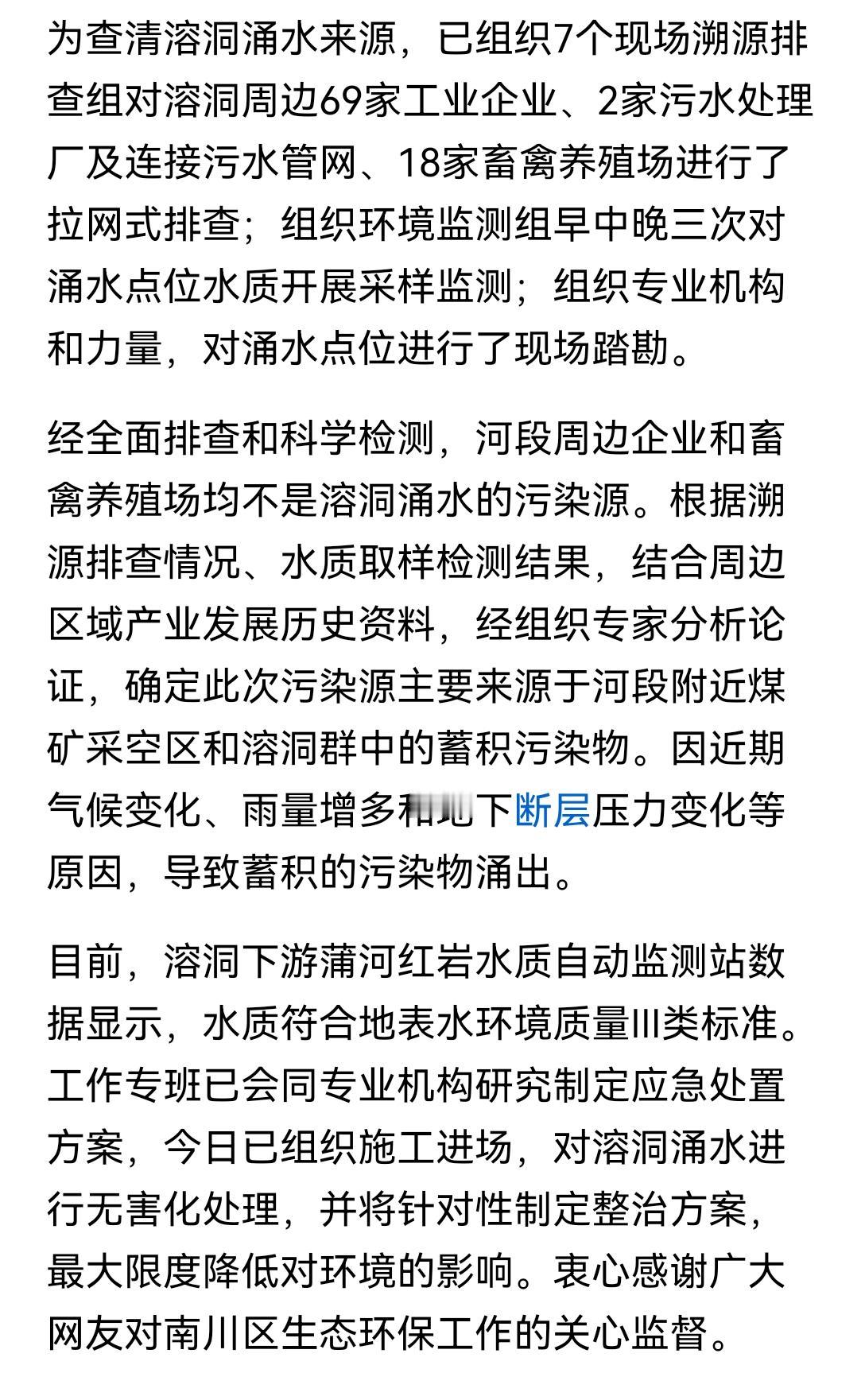 南川“孝子河污染”的调查结果来了,非常意外——当地生态环境局通报:经“拉网式排查”,周边企业和养殖场“均不是”污染源,“专家认定”主要污染源是“煤矿采空区与溶洞群中的积蓄污染物” 只能说——污染溯源是专业问题,必须专业人士才能判定,但愿现在的“技术判断”,经得起历史检验
