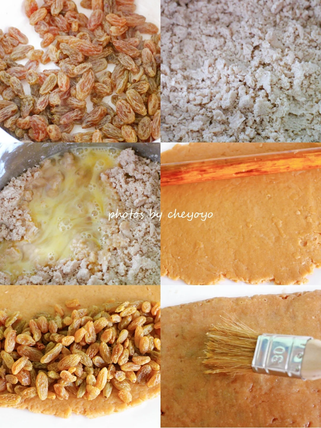 ④ 面团擀成方形,再中下部铺上葡萄干,叠起中上部后再擀平;