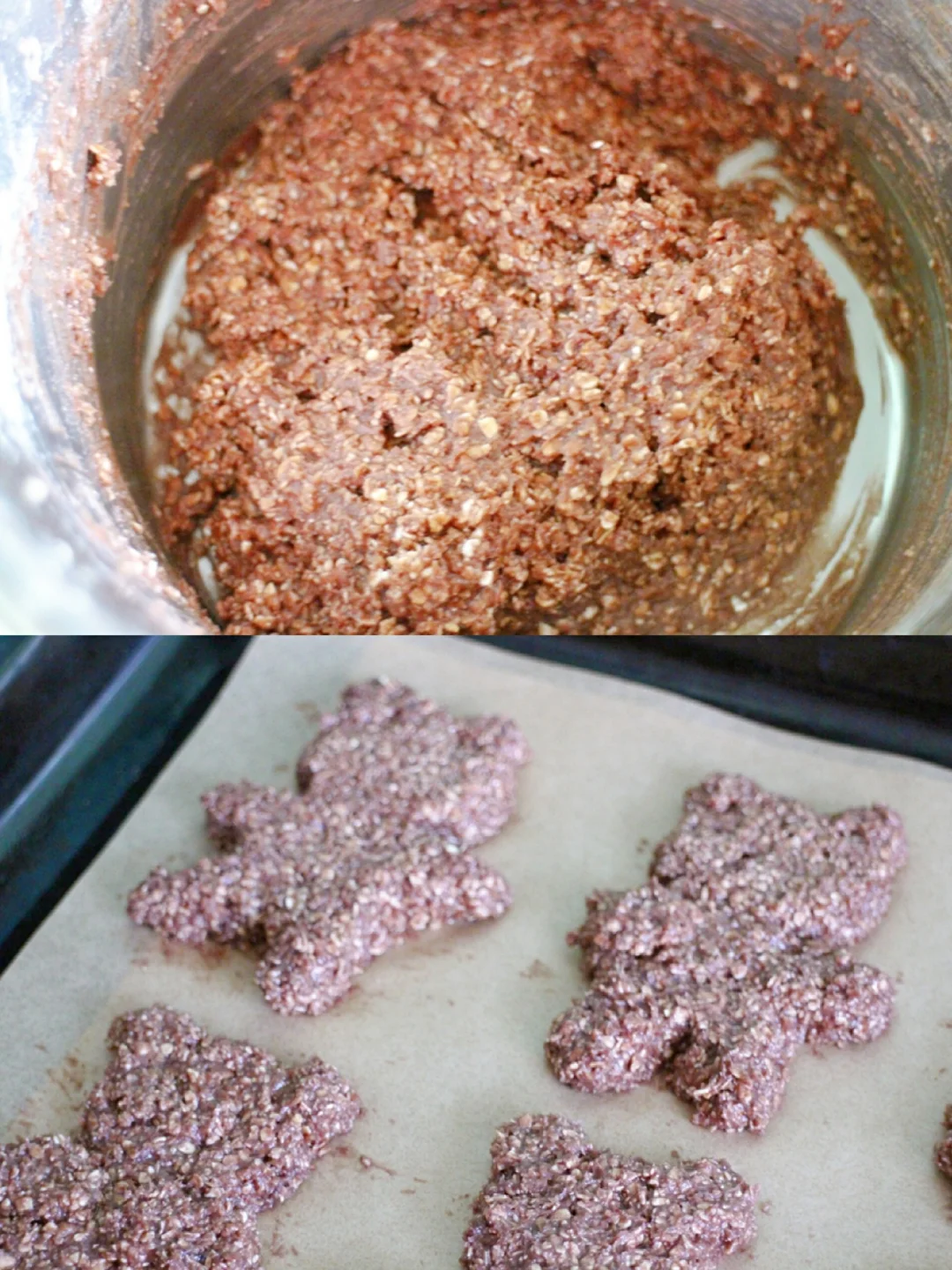 ④ 烤盘上铺油纸,用面团在油纸上整理出小熊造型;