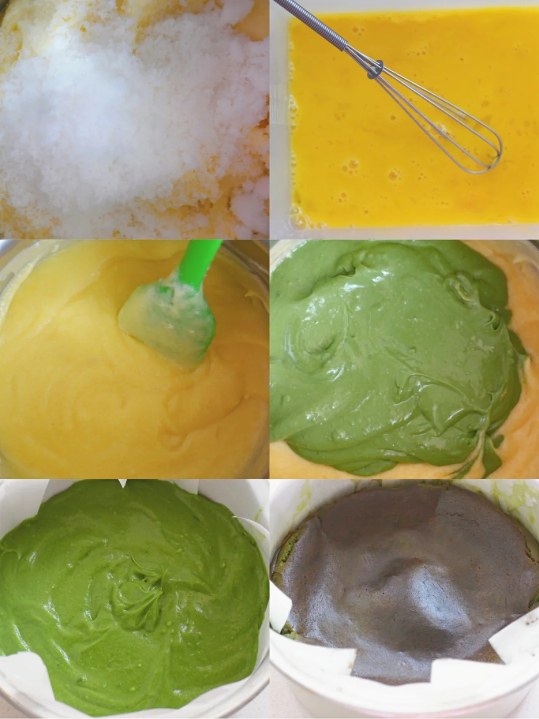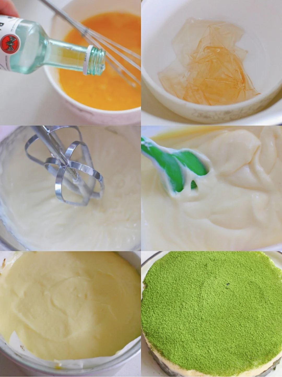 ⑤ 淡奶油打至6分发,与奶酪糊混合拌匀,倒在晾凉的抹茶巴斯克上,放入冰箱冷藏4小时左右;
