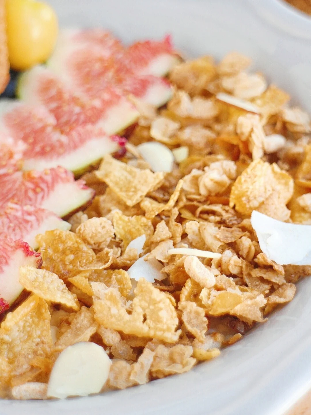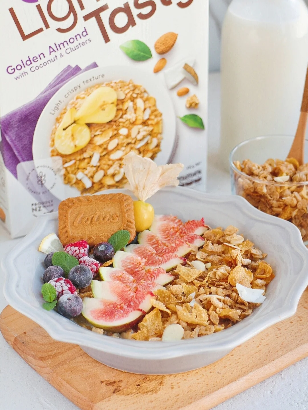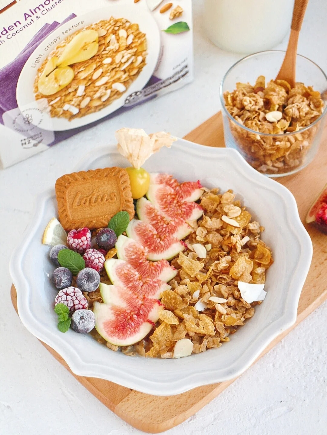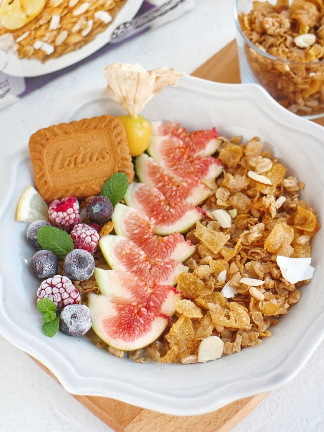 ③ 撒上脆多多即食麦片,摆上无花果、桨果就可以了。