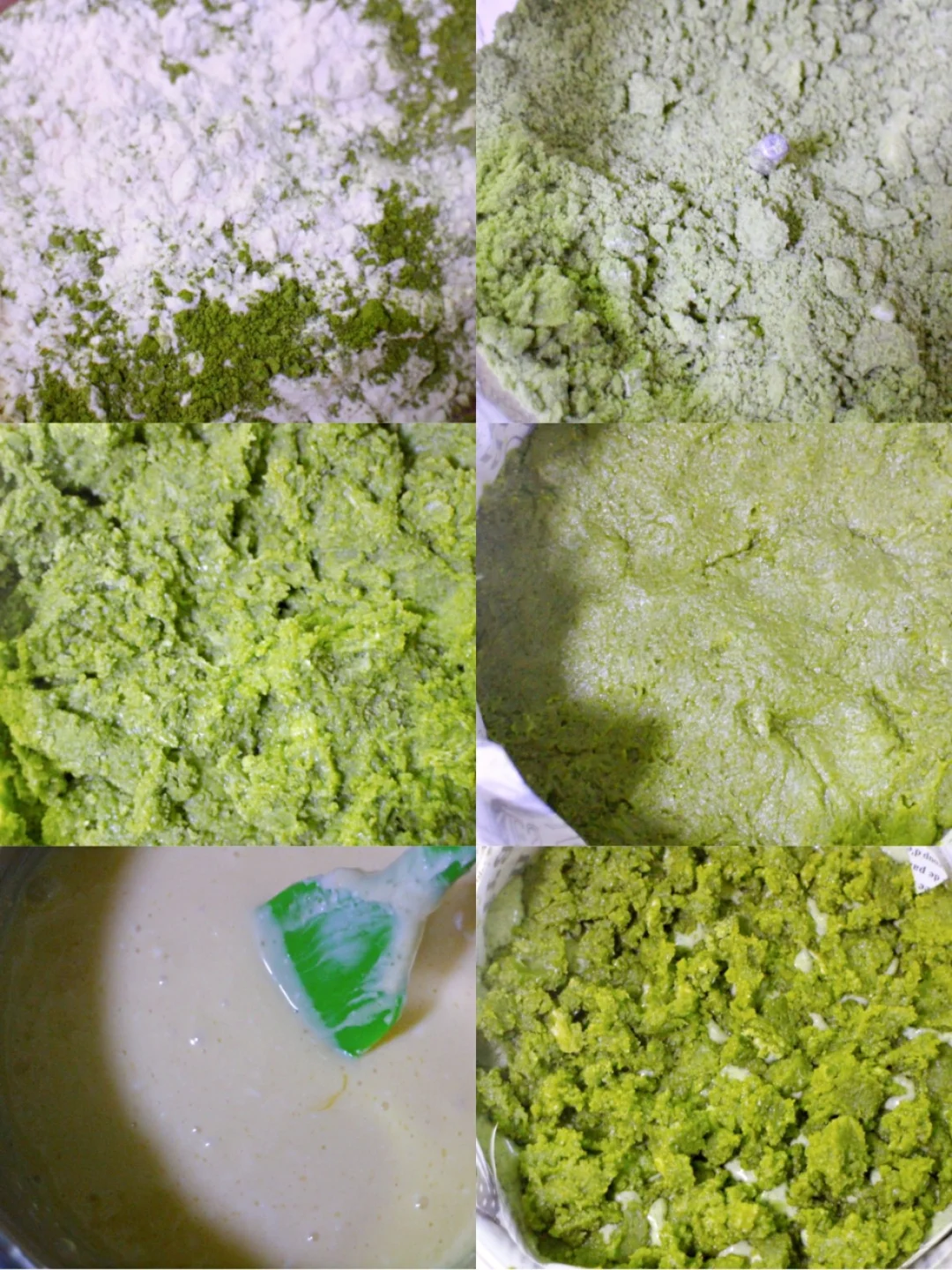 ① 低粉、抹茶粉、泡打粉、砂糖、盐混合,和冷黄油一起放入料理机中搅打,倒入打散的蛋液,翻拌均匀;