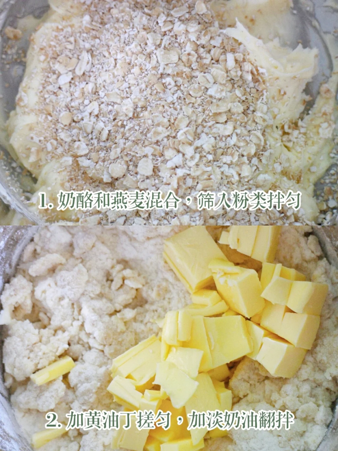 ① 软化的奶油奶酪和燕麦混合搅匀,筛入面粉、泡打粉、砂糖,翻拌均匀;