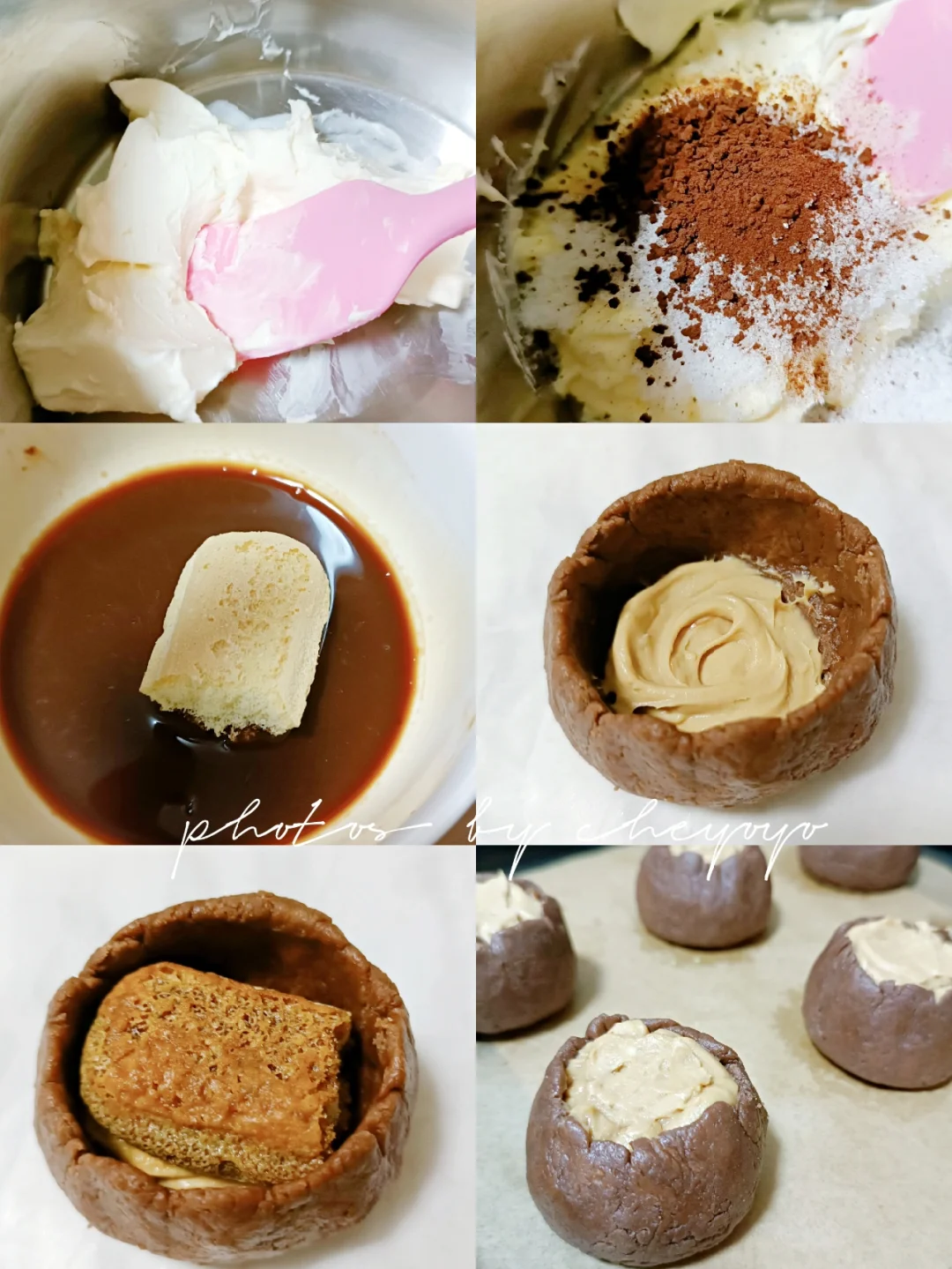 ④ 面团均匀分成6份,捏成小碗状,挤入一些乳酪,放上蘸好咖啡液的手指饼,再挤满乳酪;