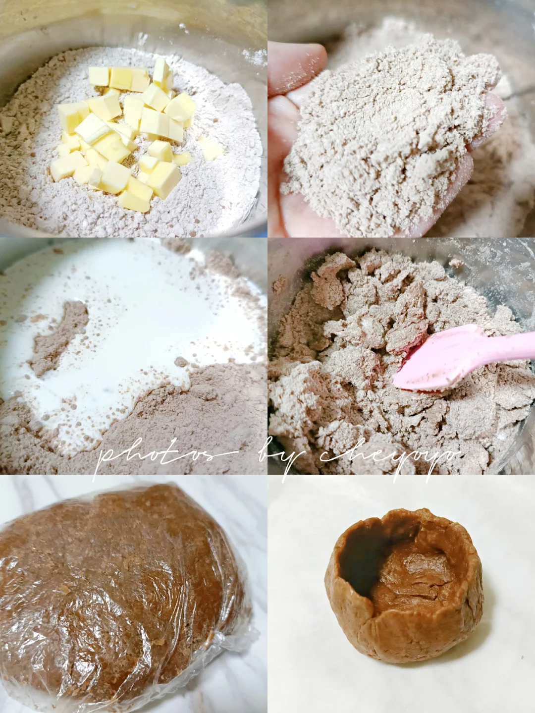 ② 低筋面粉、可可粉、泡打粉、砂糖、盐混合过筛,加冷黄油丁搓成粗玉米粉状,加入淡奶油翻拌至无干粉,整理成面团,包好保鲜膜后放入冰箱冷藏半小时;