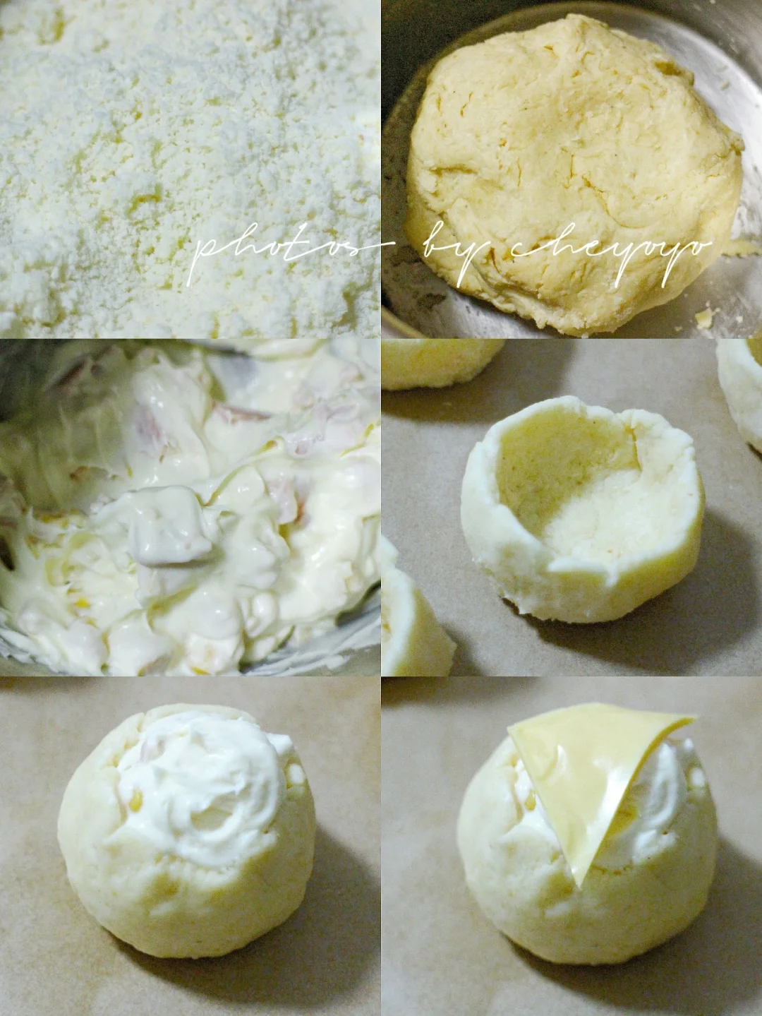 ③ 面团均匀分成6等份,捏成小碗状,挤入奶酪馅后用虎口收一下口;