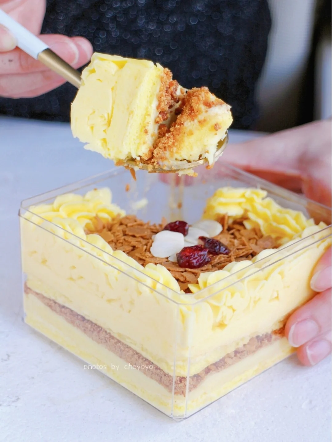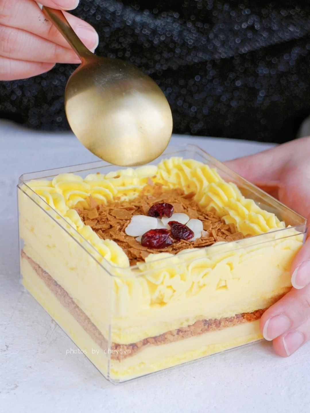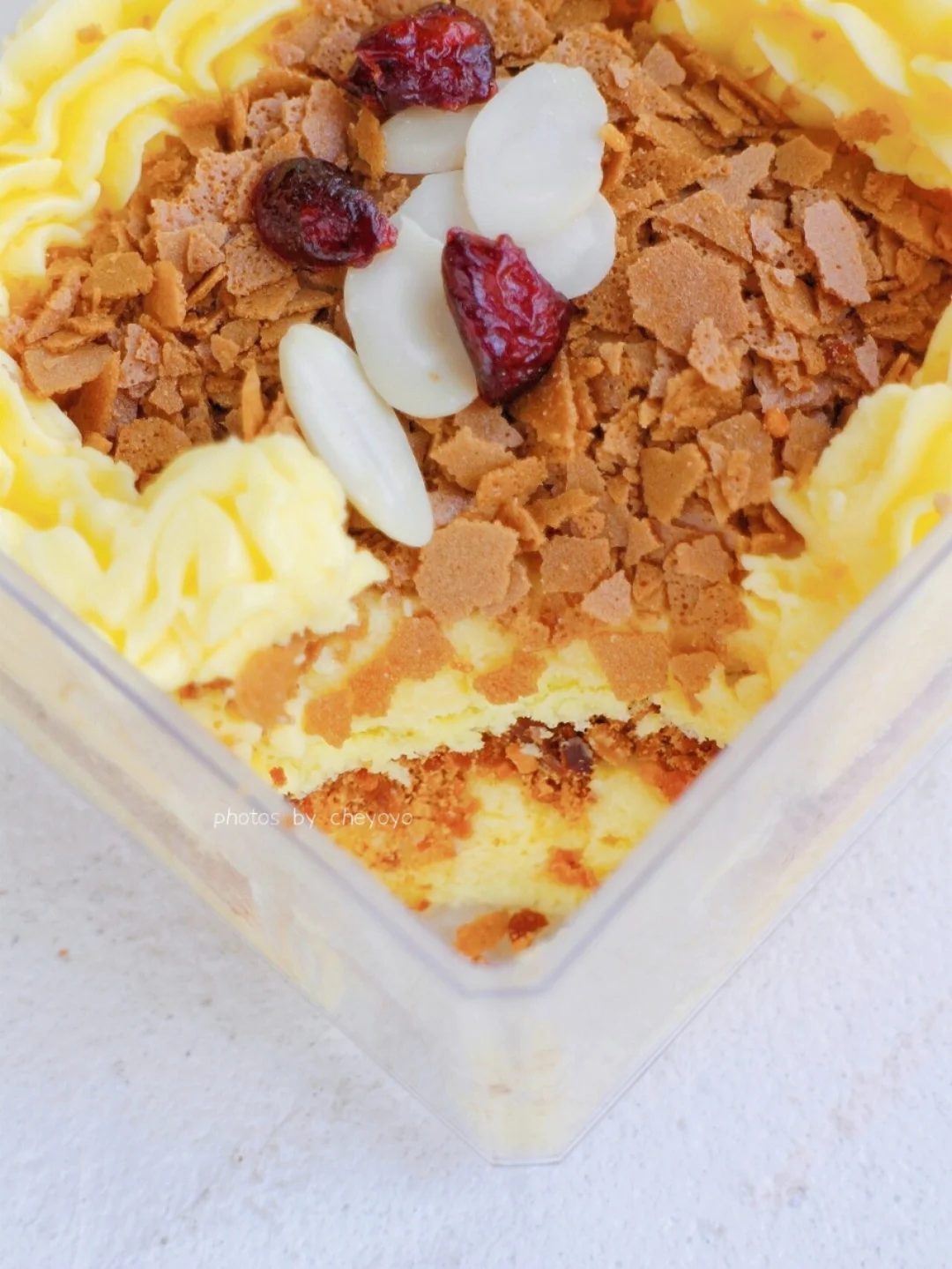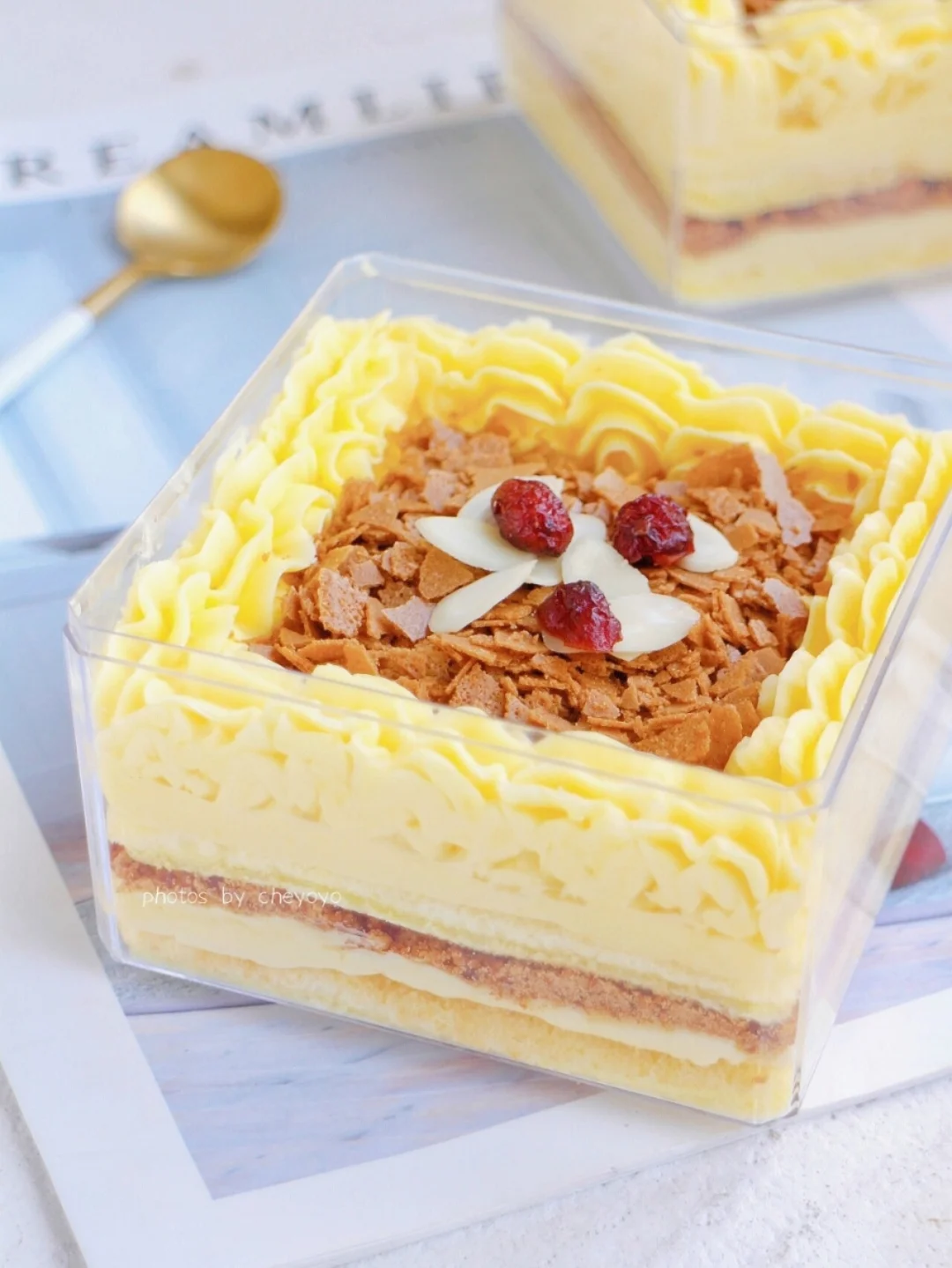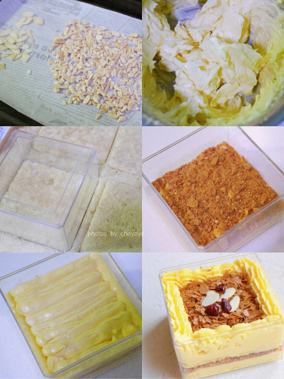 ① 蛋糕胚+咸奶油+花生碎+蛋糕胚+咸奶油+可可脆片,一层一层组装起来;