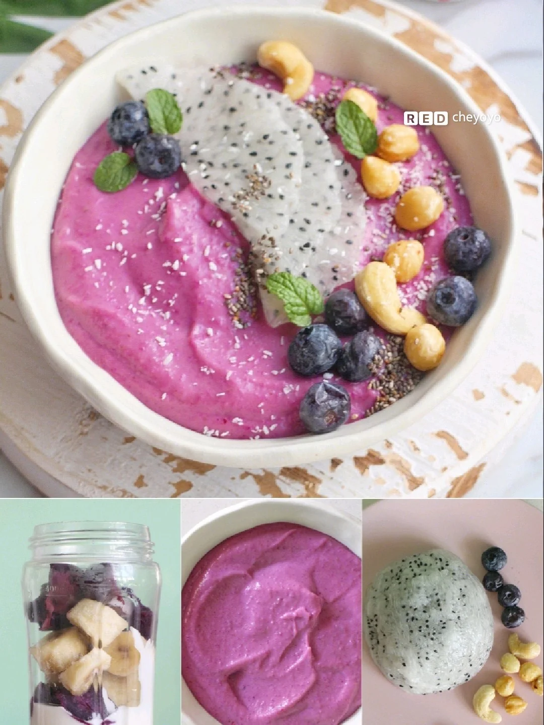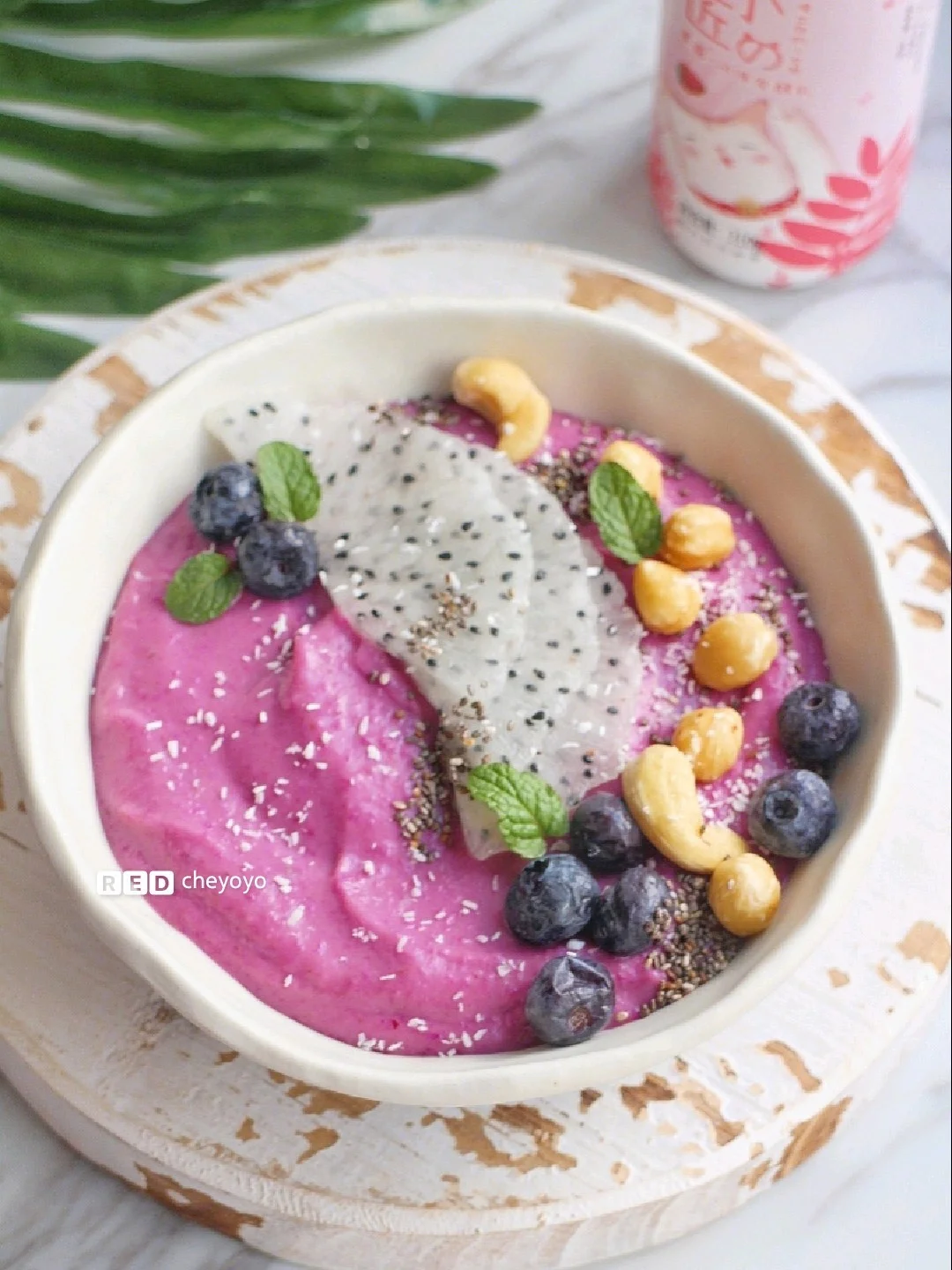 酸奶、熟紫薯、冻香蕉打底;火龙果、腰果、榛仁、蓝莓做装饰。