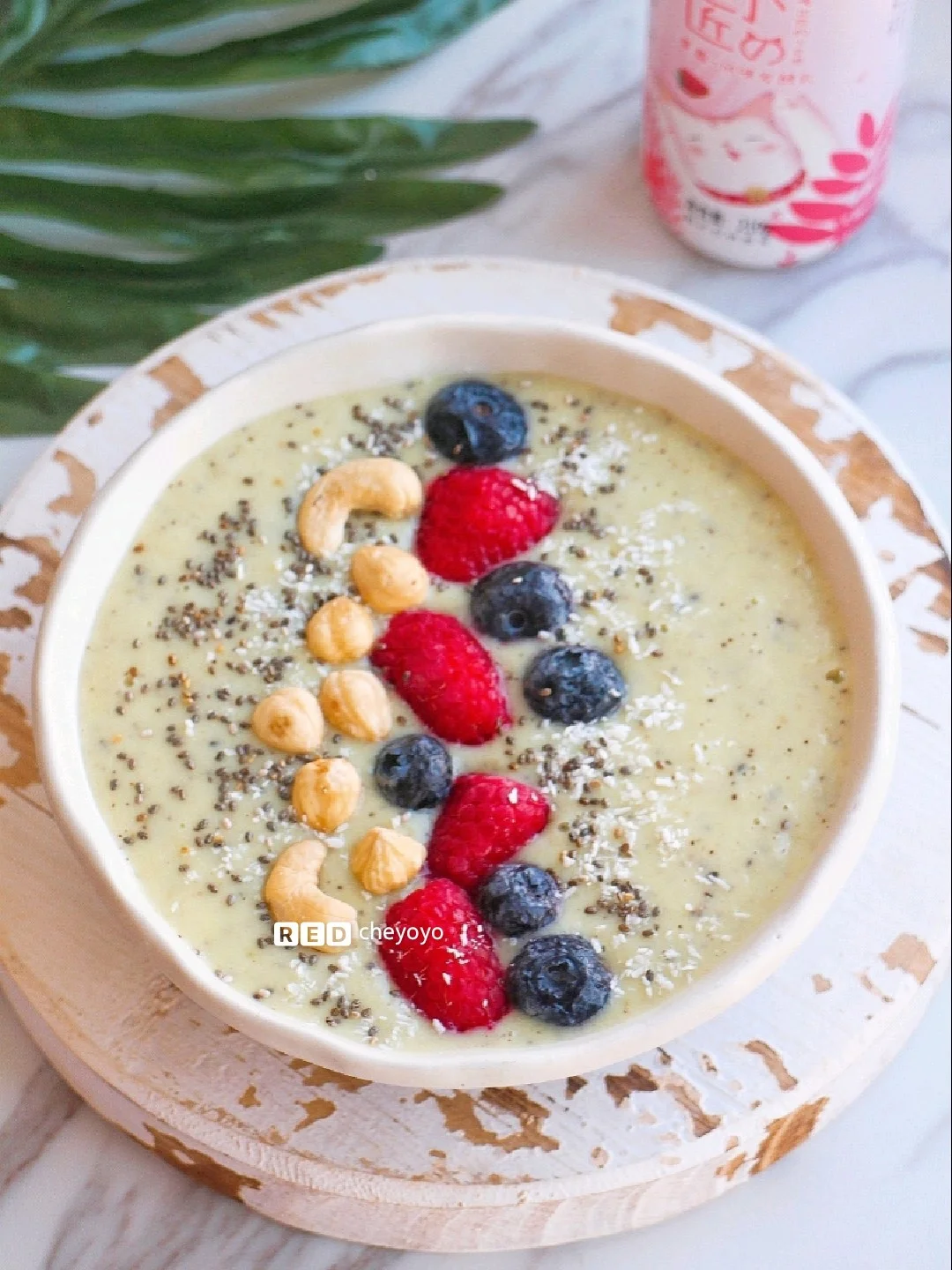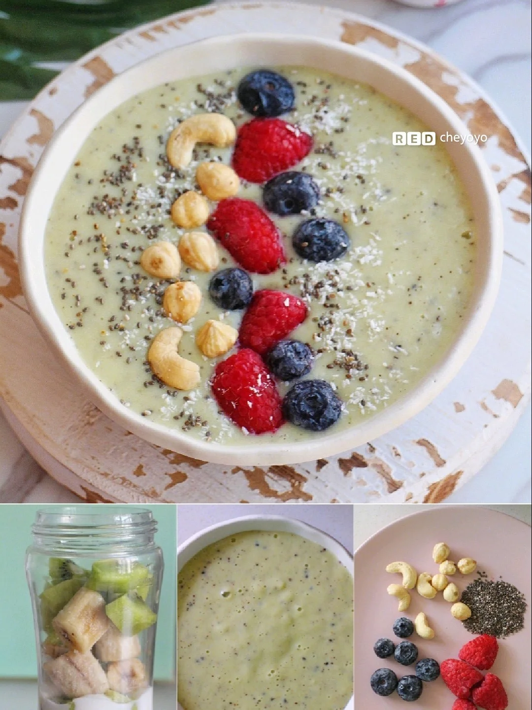 酸奶、奇异果、冻香蕉;树莓、蓝莓、腰果、榛仁、椰蓉、奇亚籽做装饰。(可以在打底食材中加入菠菜或碗豆,颜色更好看)