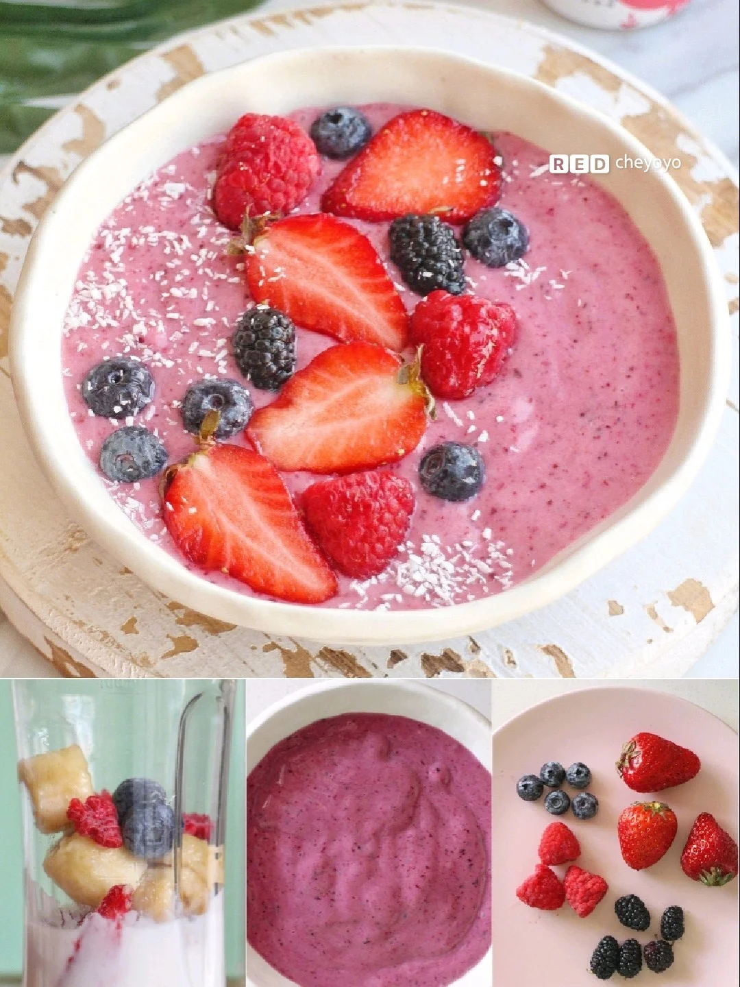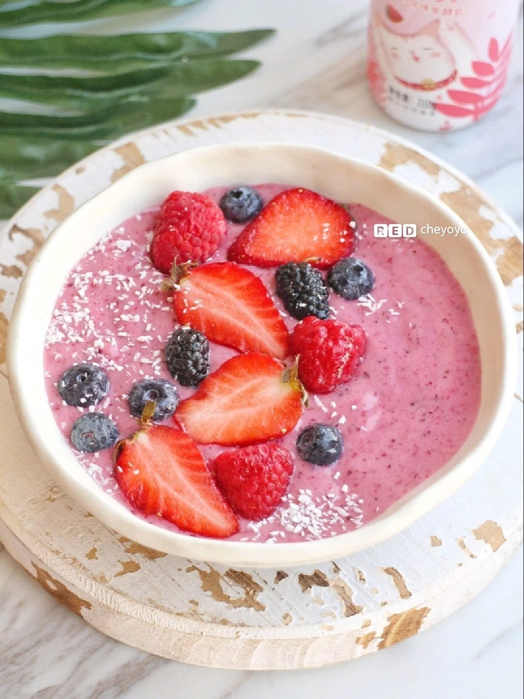 酸奶、草莓、冻香蕉、蓝莓、树莓打底;草莓、蓝莓、树莓、椰蓉做装饰。
