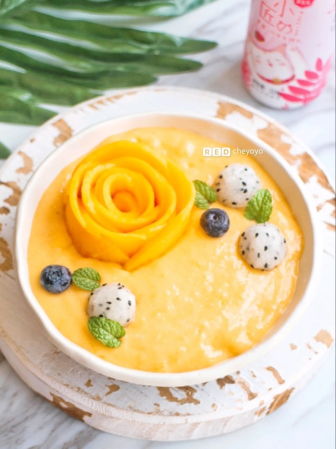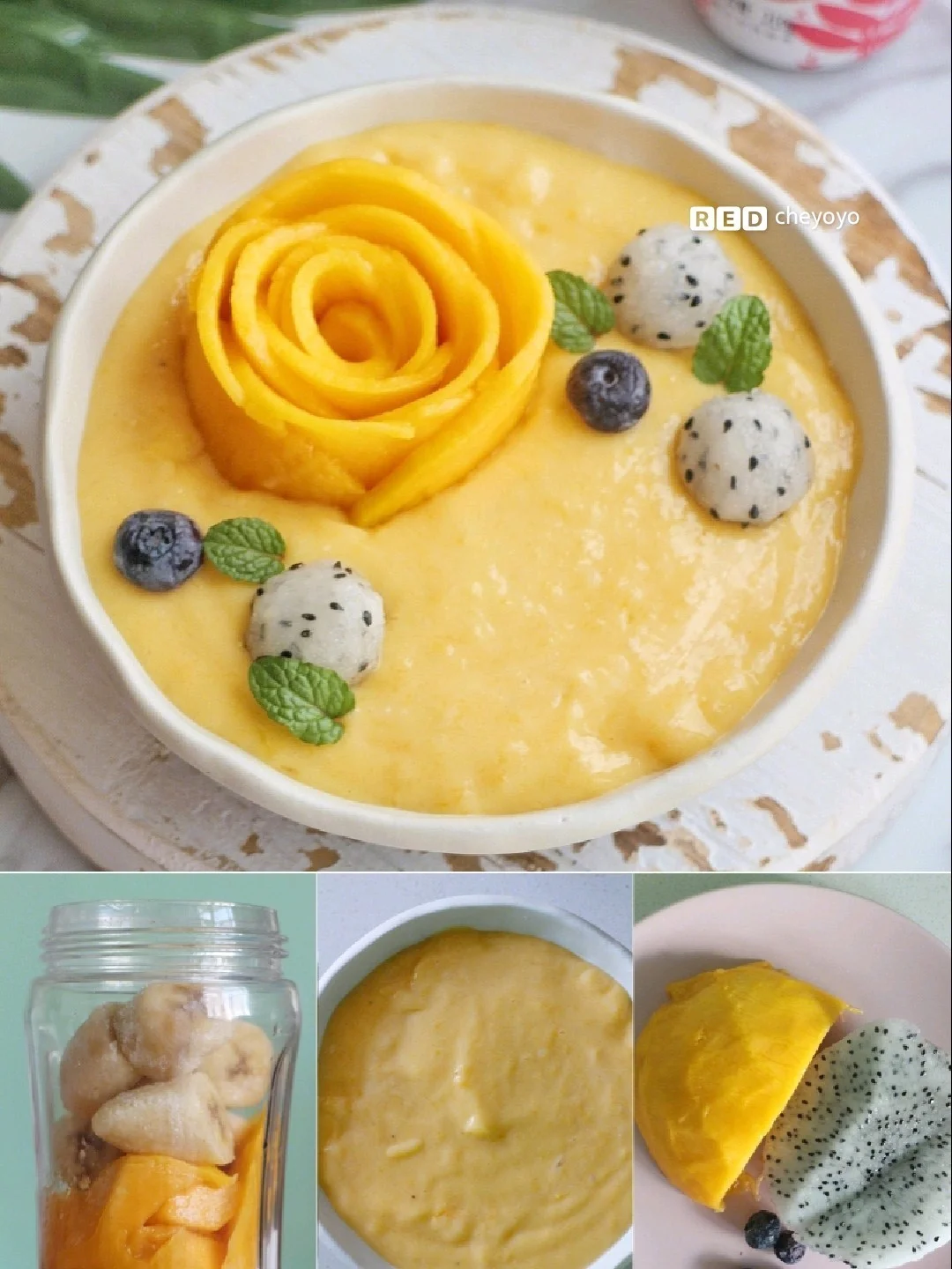 酸奶、芒果、冻香蕉打底;芒果、火龙果、蓝莓做装饰。