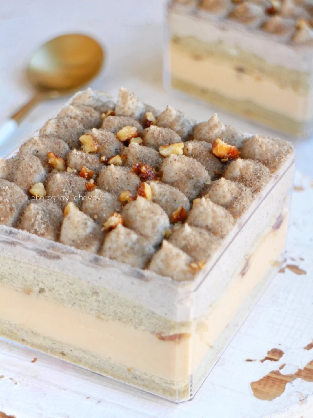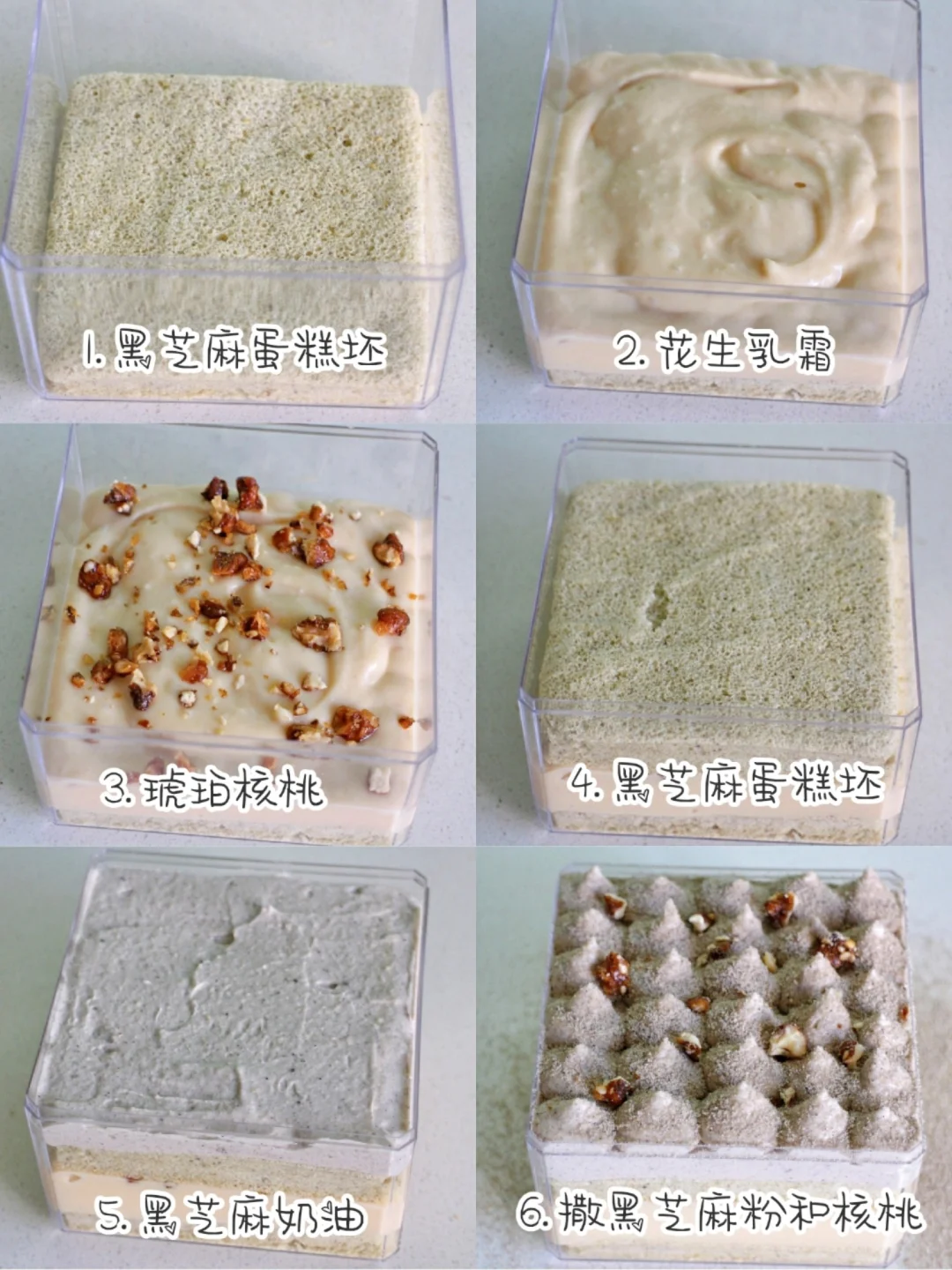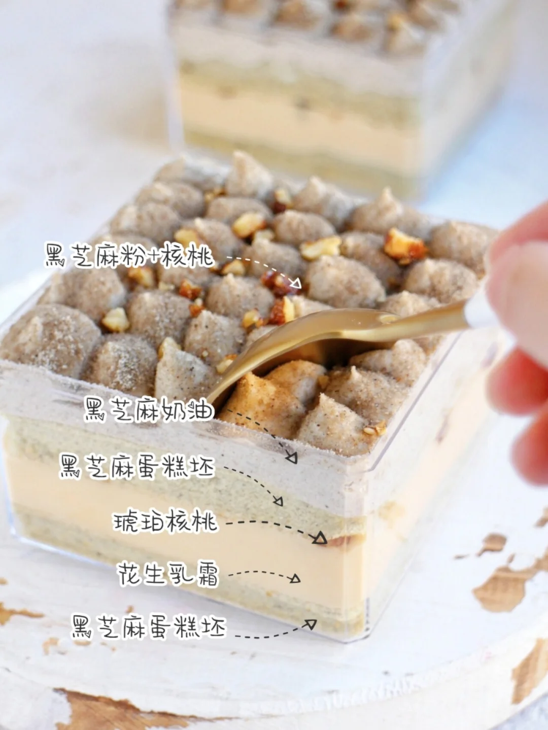 ① 蛋糕胚+花生乳霜+琥珀核桃+蛋糕胚+黑芝麻奶油,一层一层组装起来;