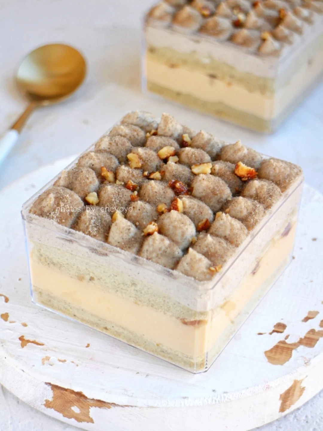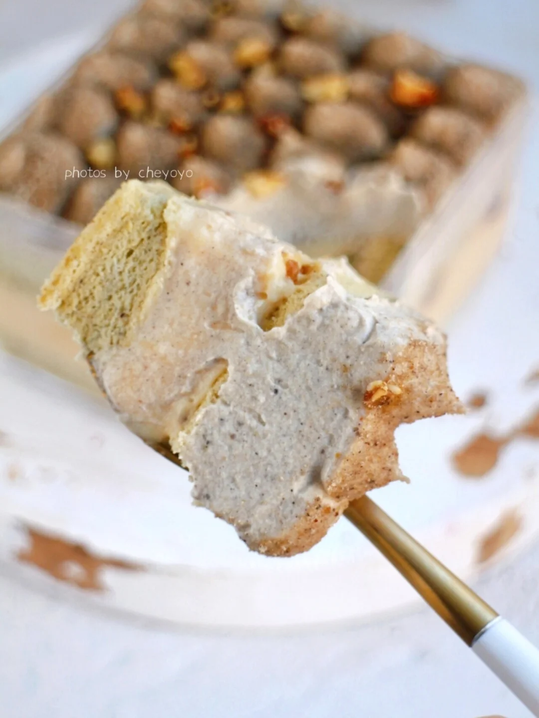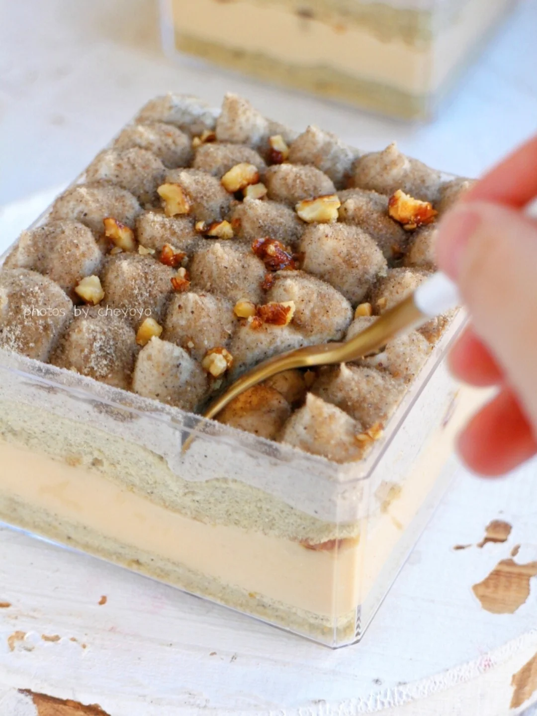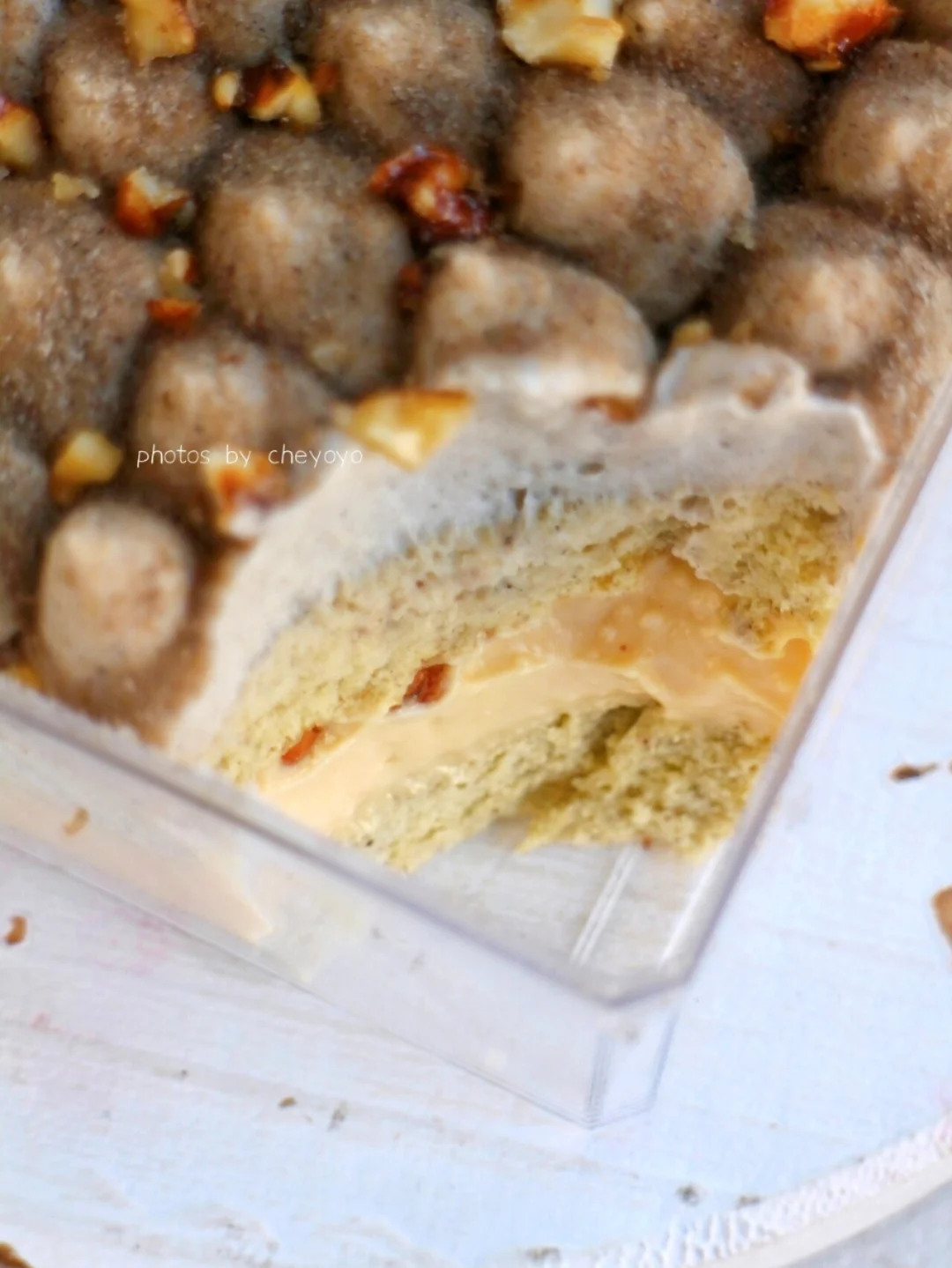 ① 蛋糕胚+花生乳霜+琥珀核桃+蛋糕胚+黑芝麻奶油,一层一层组装起来;