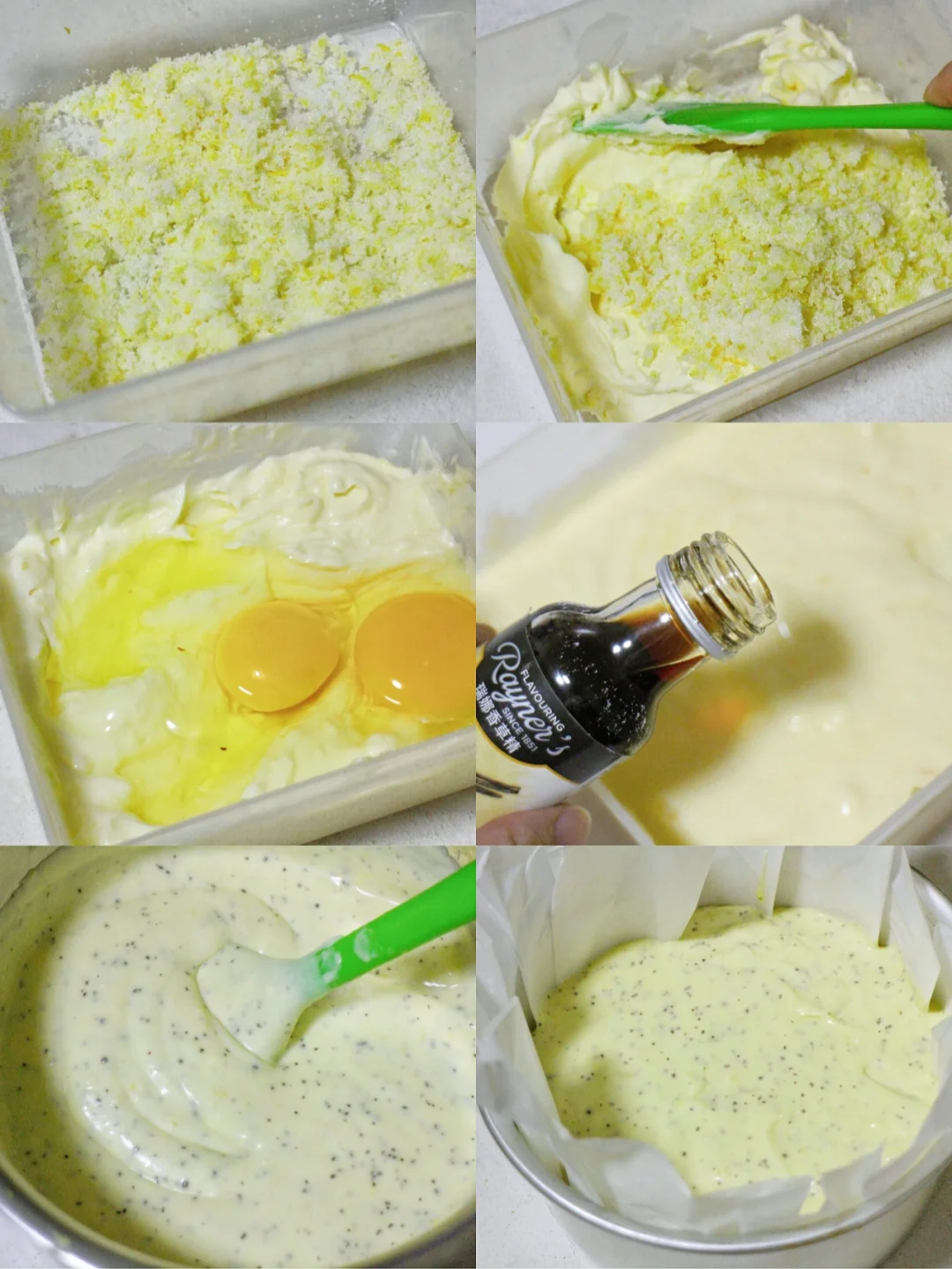 ② 室温软化的奶油奶酪加入柠檬砂糖,用打蛋器打至顺滑,加入淡奶油搅拌均匀,加入鸡蛋搅拌均匀,加入香草精搅拌均匀;