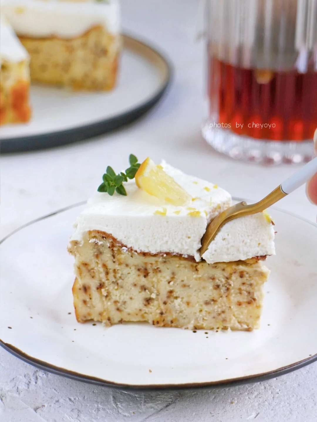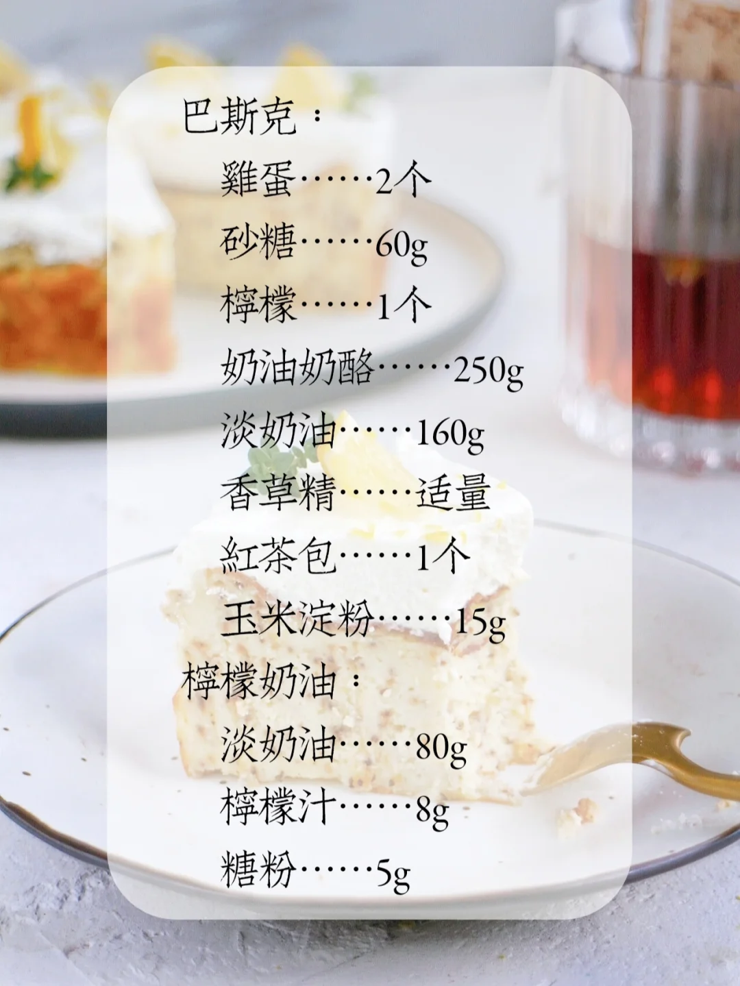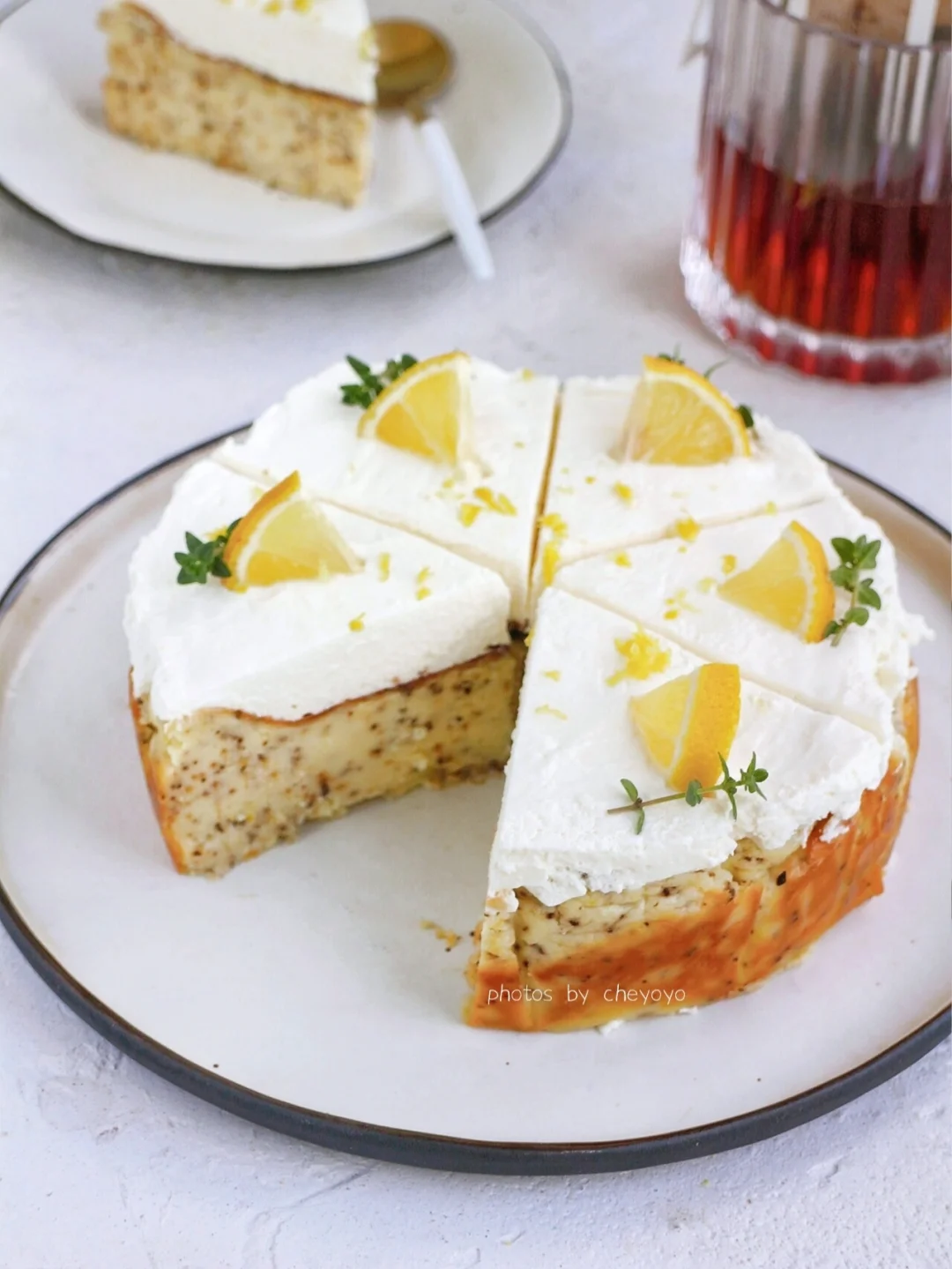 ⑥ 淡奶油、柠檬汁、砂糖混合打发,抹在红茶巴斯克表面,再用柠檬和百里香进行装饰。