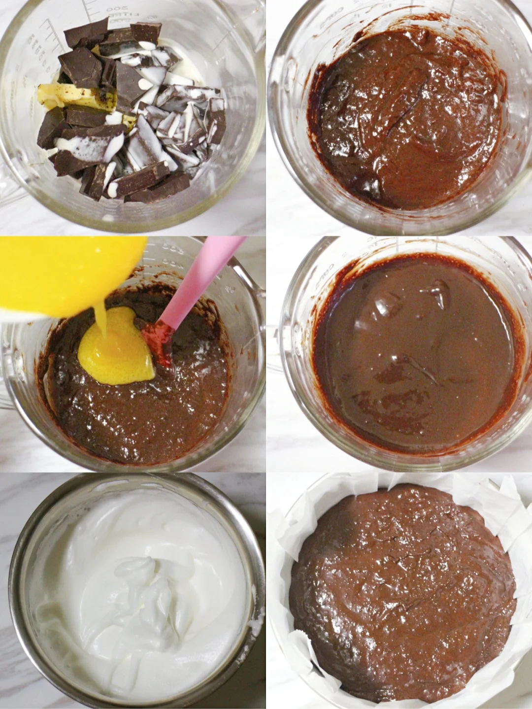 ⑤ 取一部分蛋白与巧克力糊翻拌,再倒回蛋白中翻拌均匀,倒入铺好油纸的6寸圆模中,抹平表面,震出气泡;